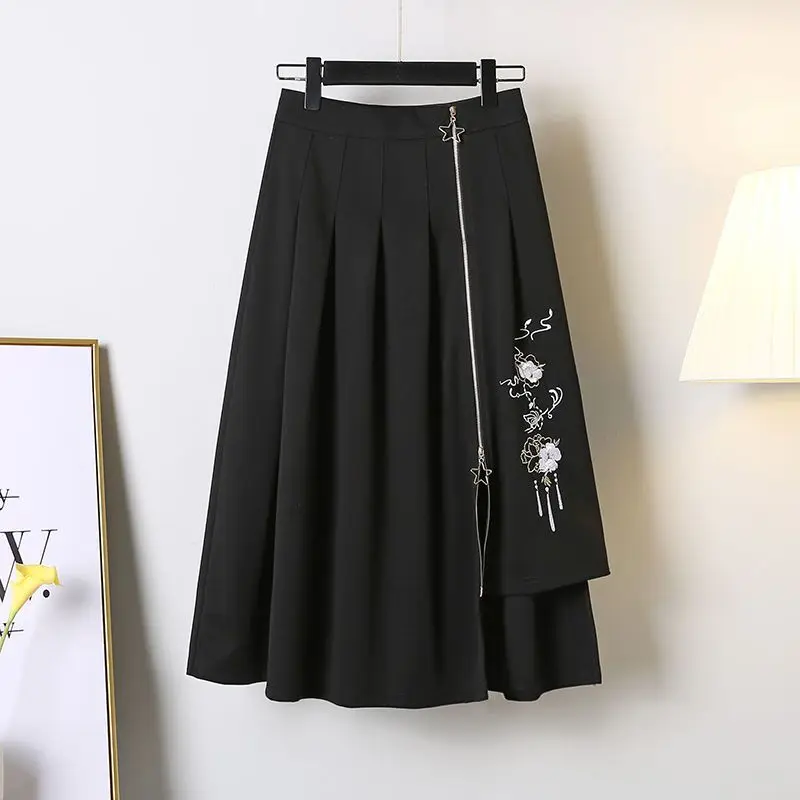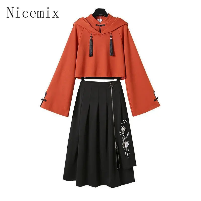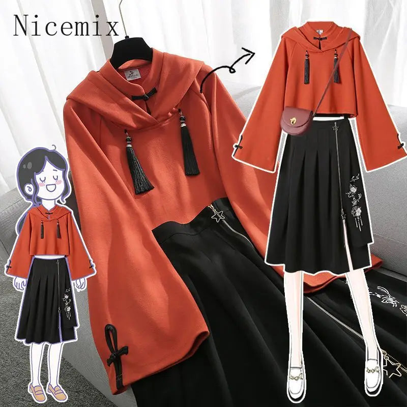 Yipinpay Women Set Early Autumn New Chinese Style Age Reducing Sweet Slim Red Sweatshirt Black Long Skirt Two Piece Set Women Outfits