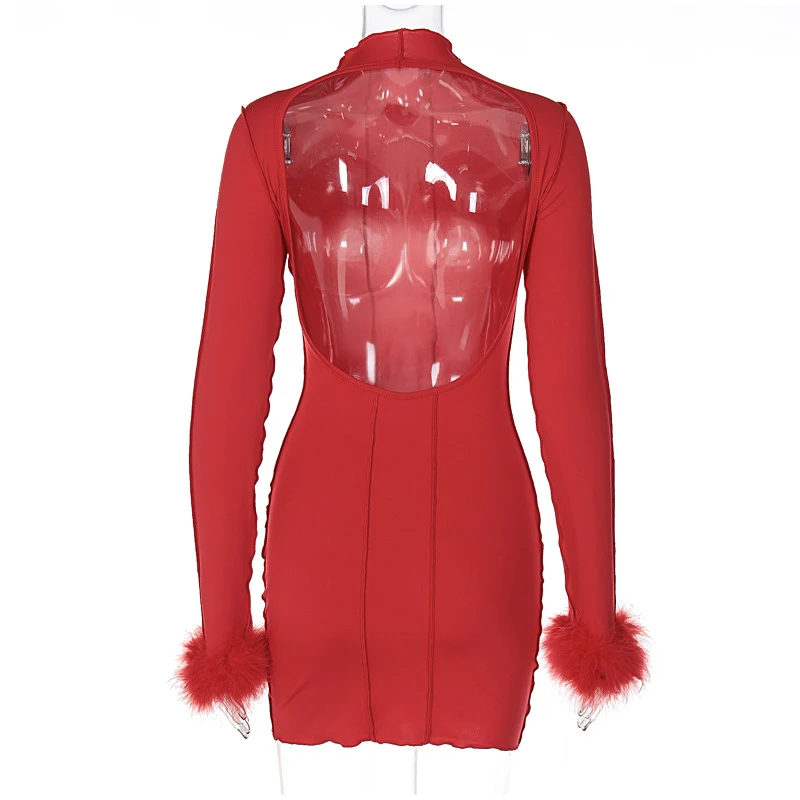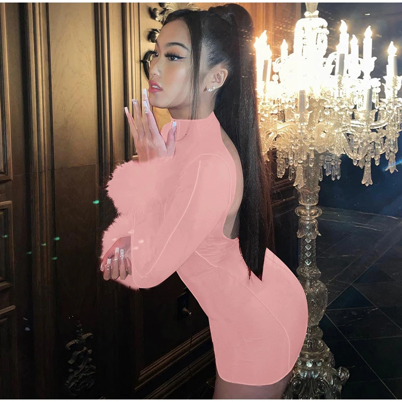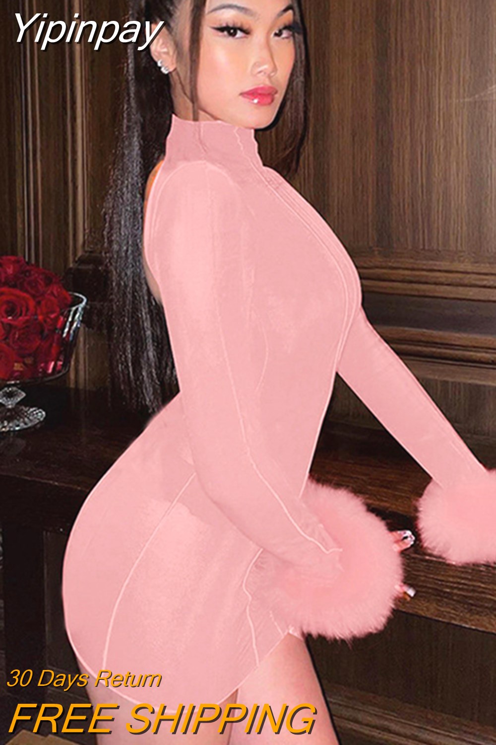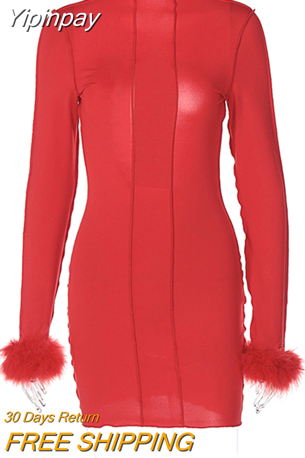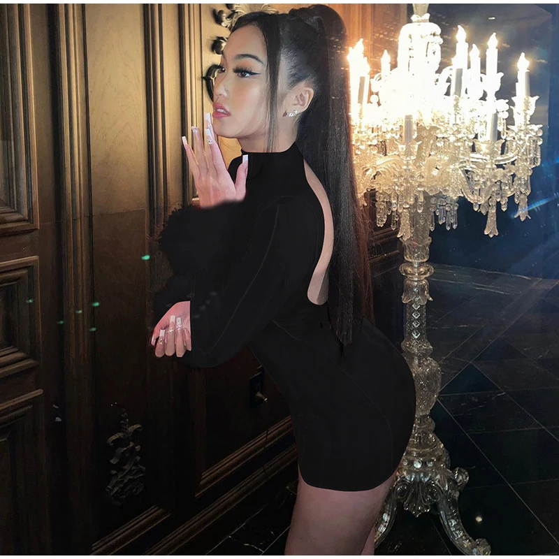 Yipinpay Women Sexy Cuff Feather Patchwork Mini Dresses Fashion Backless See Through Hips Dresses 2023 Chic Slim Party Prom Vestidos