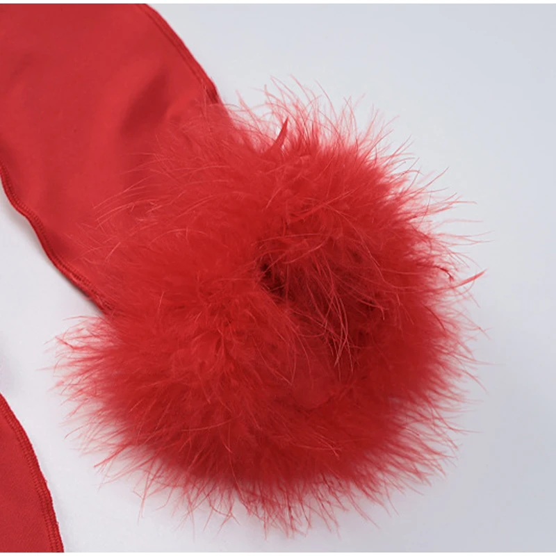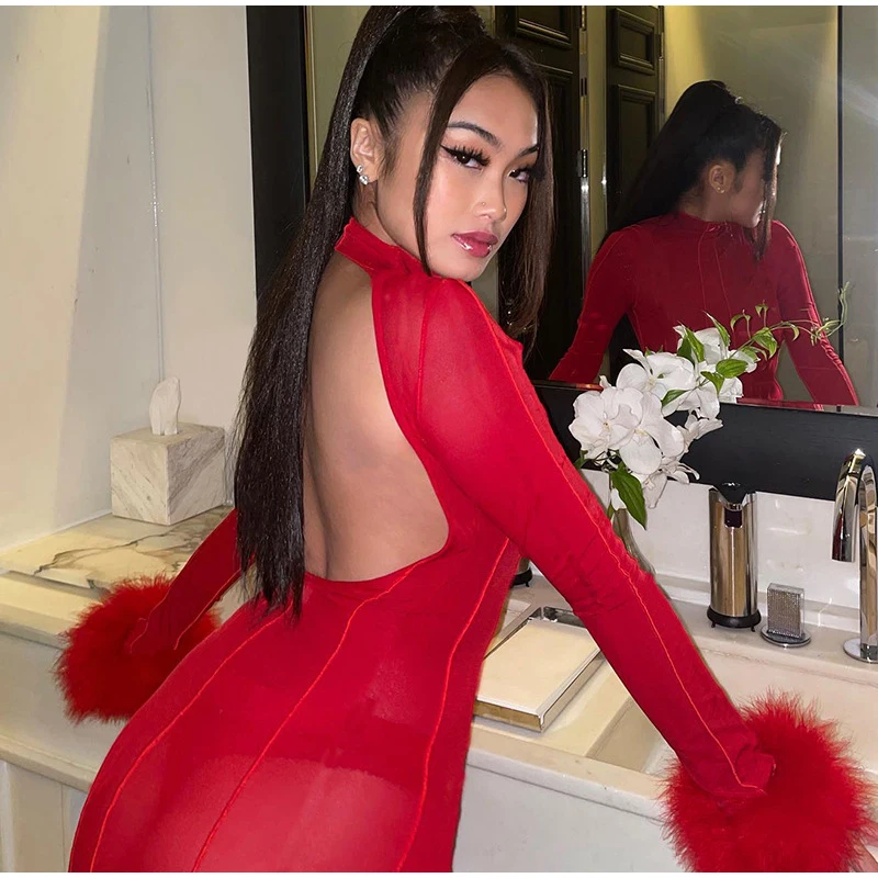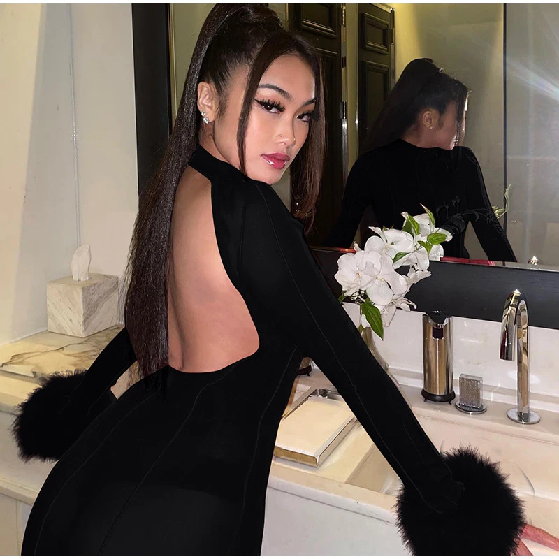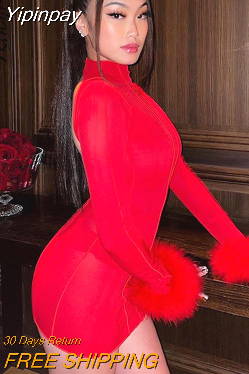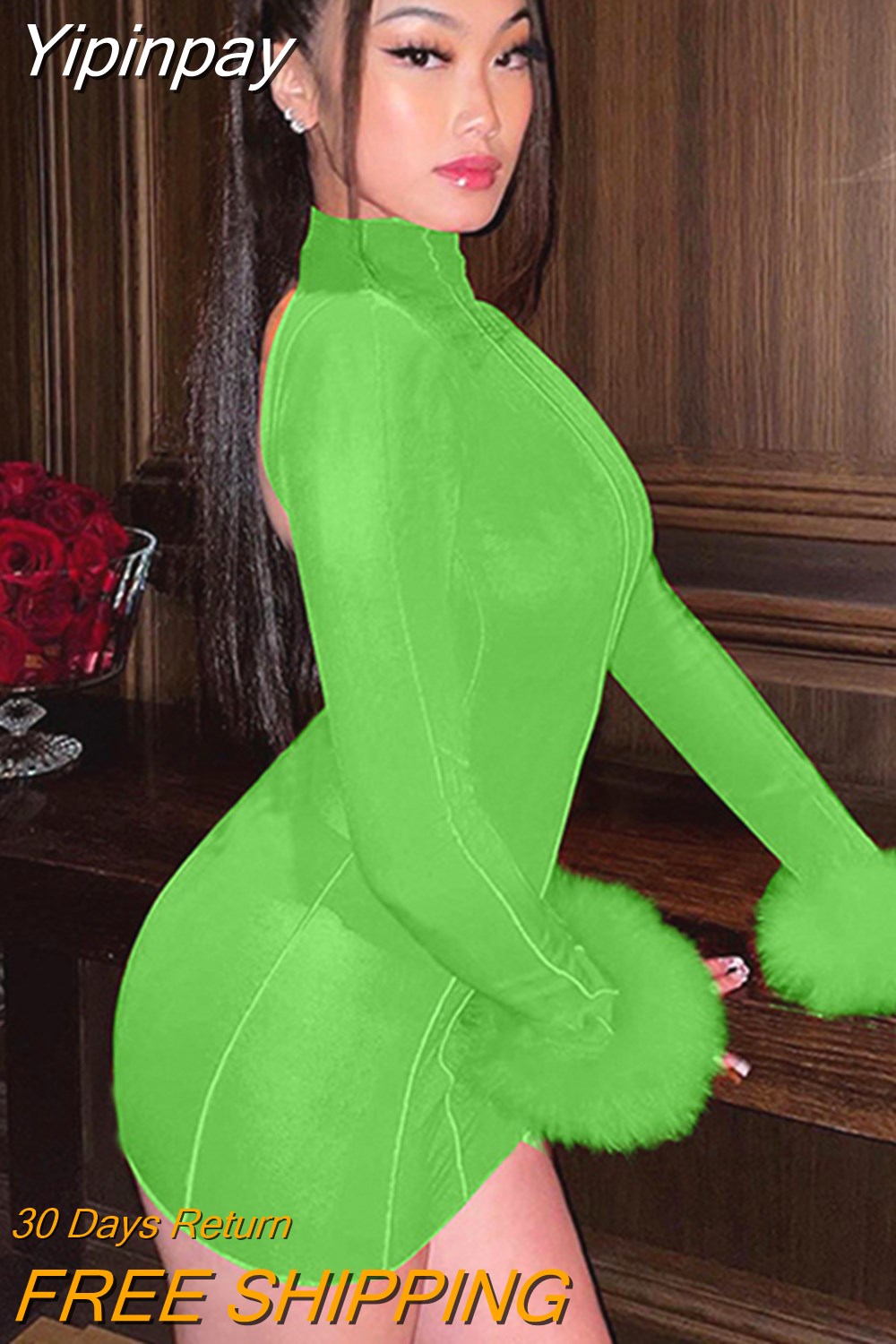 Yipinpay Women Sexy Cuff Feather Patchwork Mini Dresses Fashion Backless See Through Hips Dresses 2023 Chic Slim Party Prom Vestidos