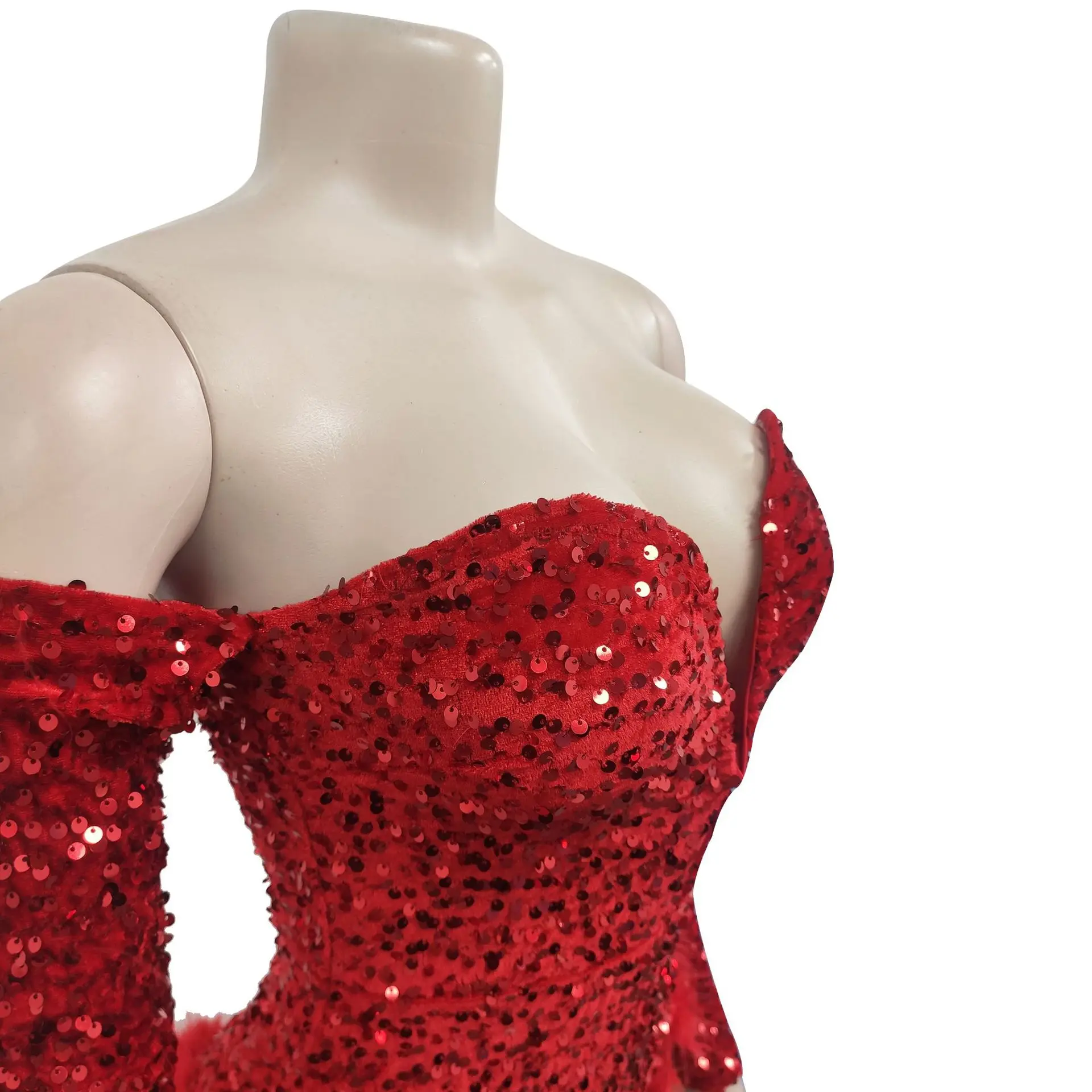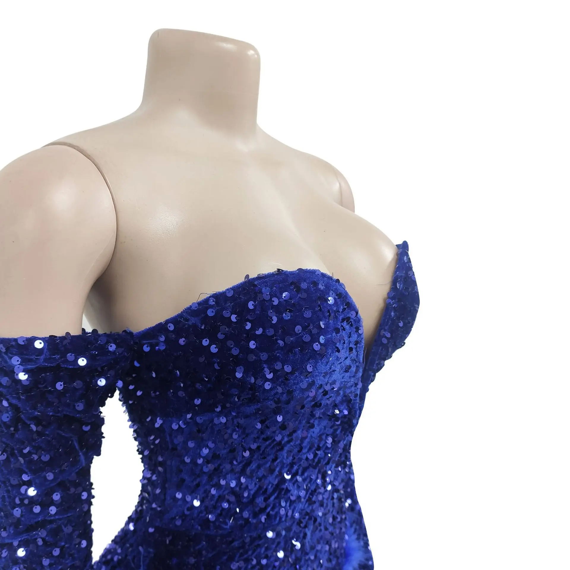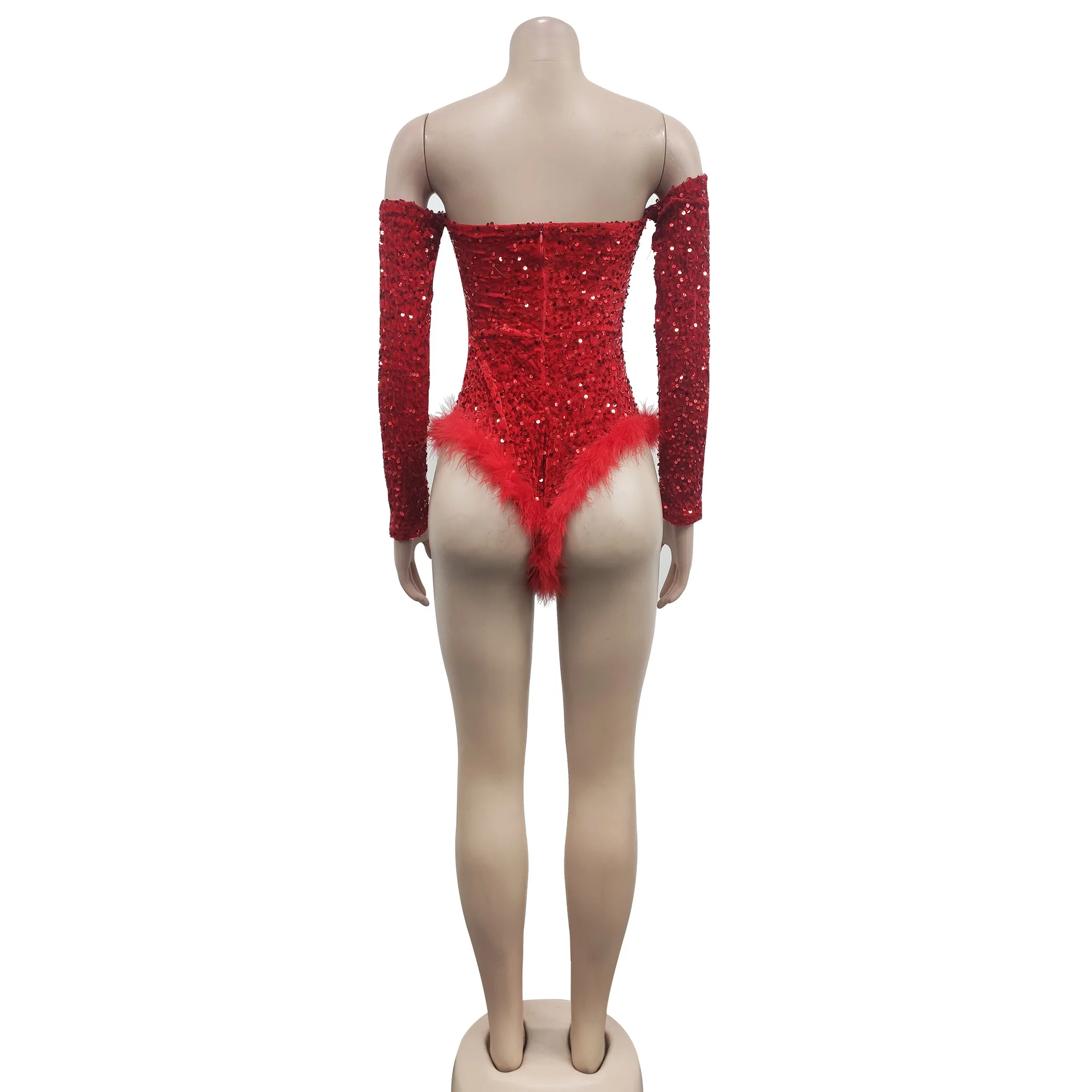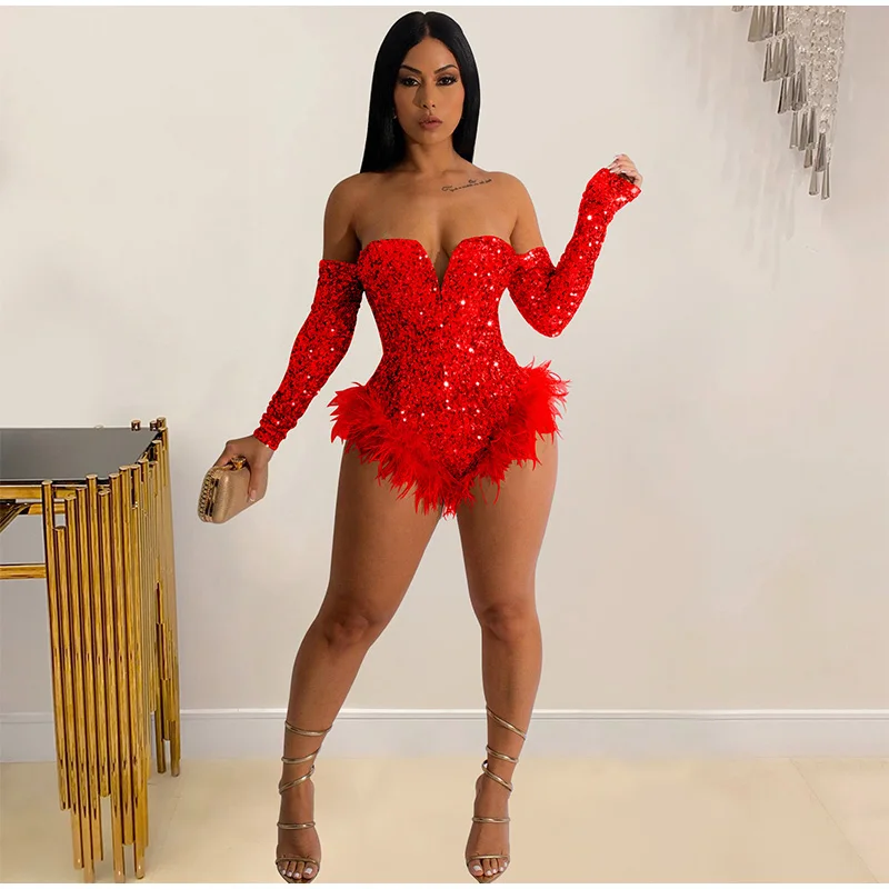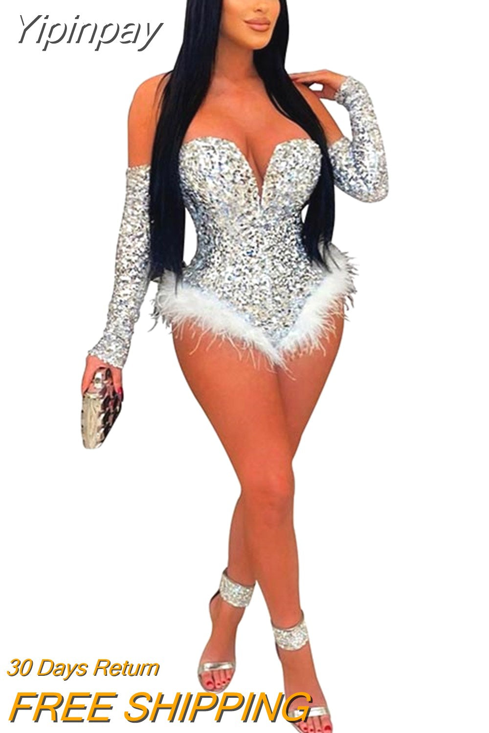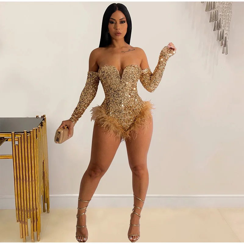 Yipinpay Women Sexy Sequined Hem Feather Bodysuits Spice Girls Off Shoulder Long Sleeve Skinny Playsuit 2023 Hot Club Party Dresswear