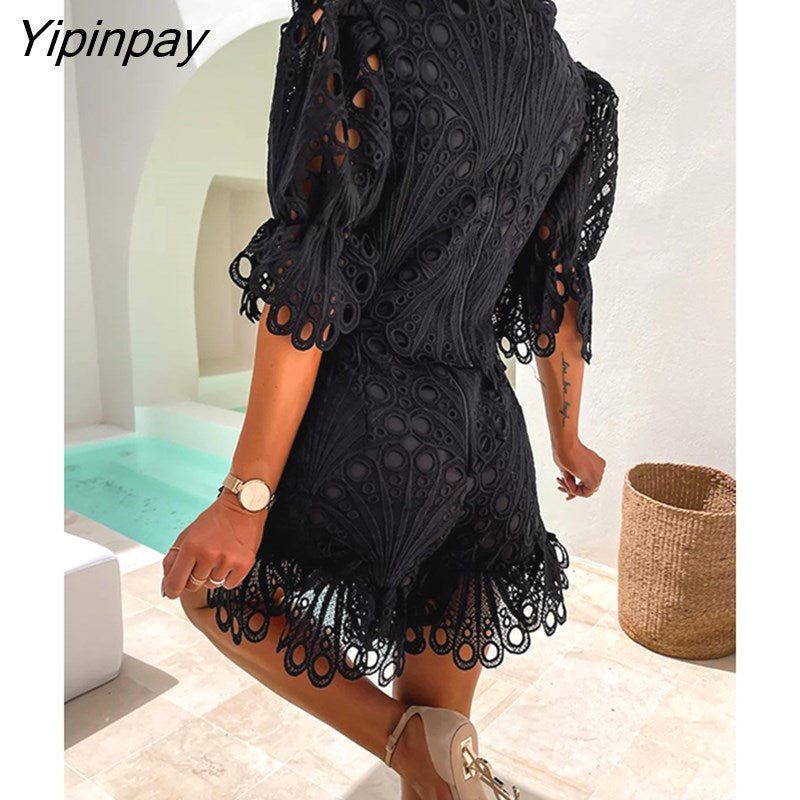 Yipinpay Women Sexy Slim Lace Hollow Out Crop Top And Ruffles Shorts Two Piece Set Female Solid Short Sleeve Shirts Tops And Shorts Set