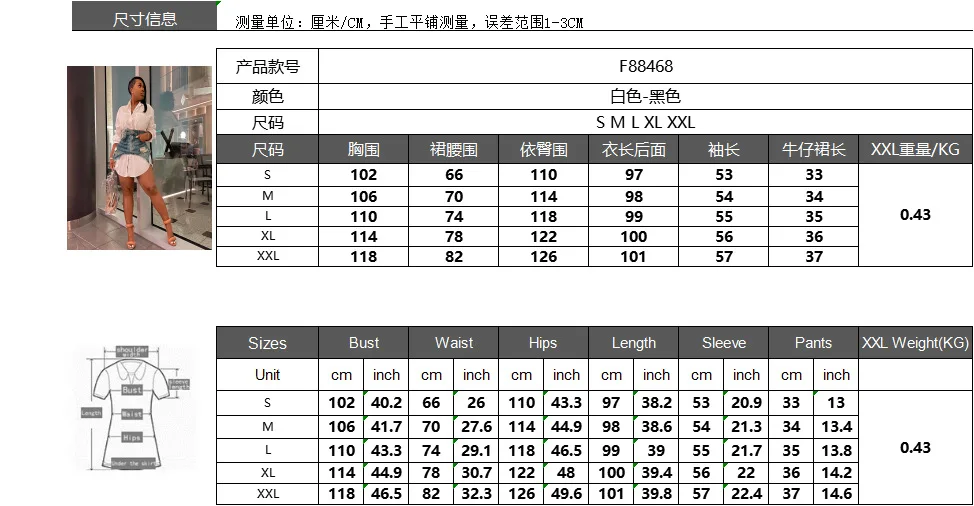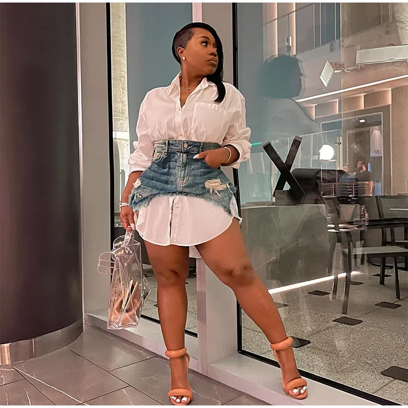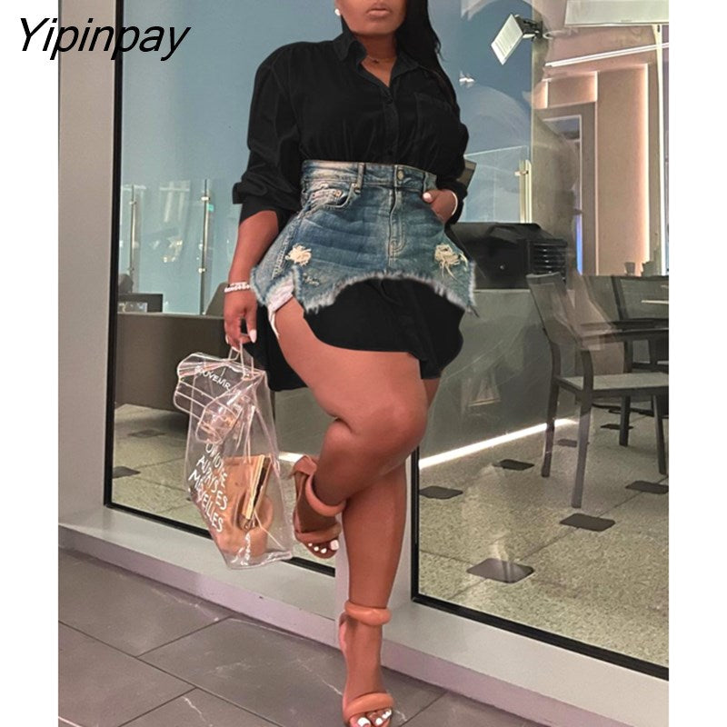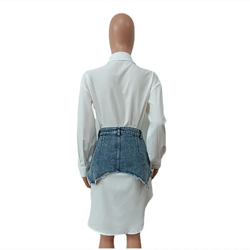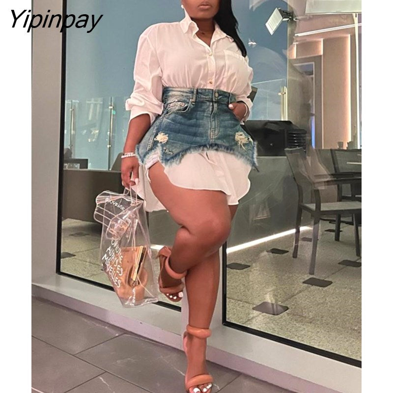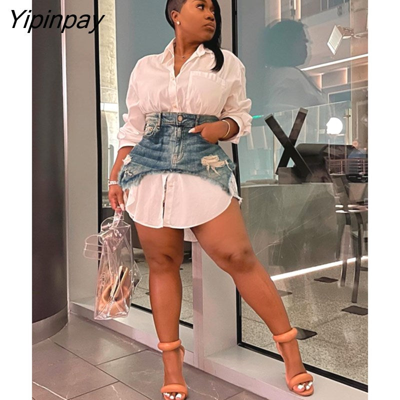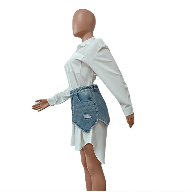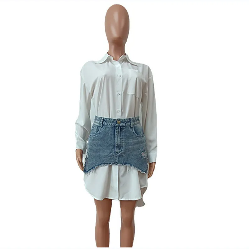 Yipinpay Women Shirt Dress With Denim Skirt Set Casual Long Sleeve Turn-down Collar Blouse Irregular Mini Skirt Two 2 Piece Set