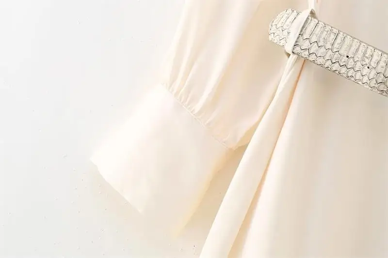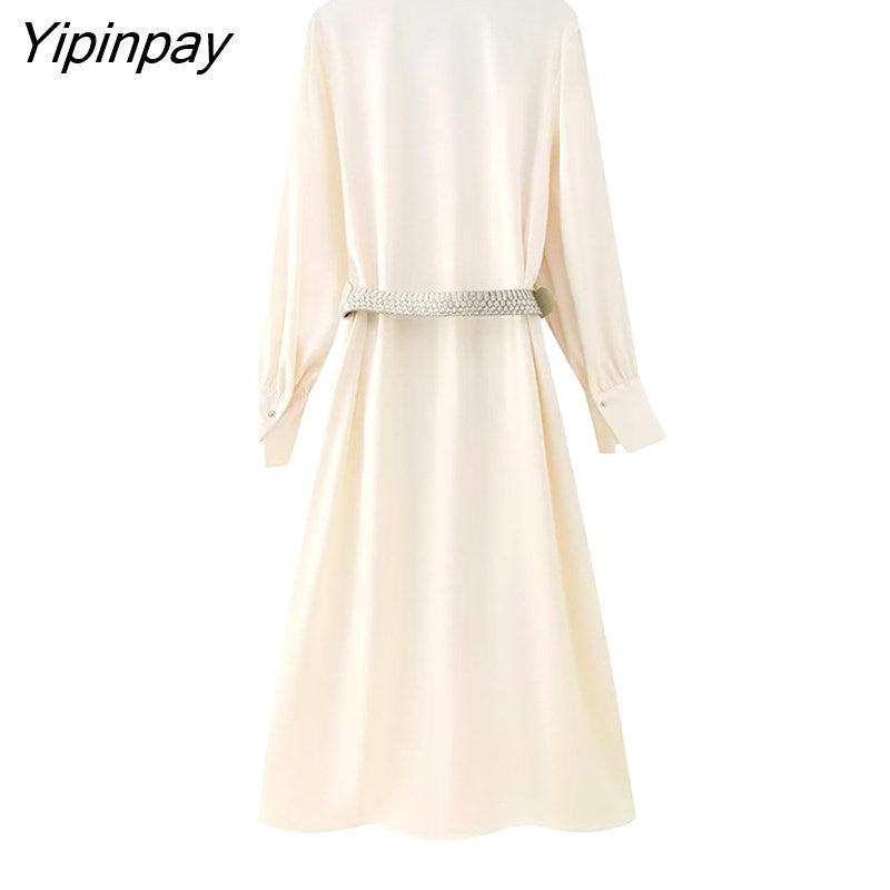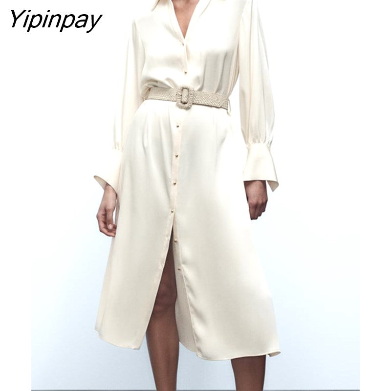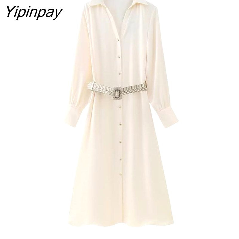 Yipinpay Women Soft Silk Loose Dresses With Belt 2023 Summer Turn Down Collar Long Dresses Sweet Fashion Long Sleeve Vestidos