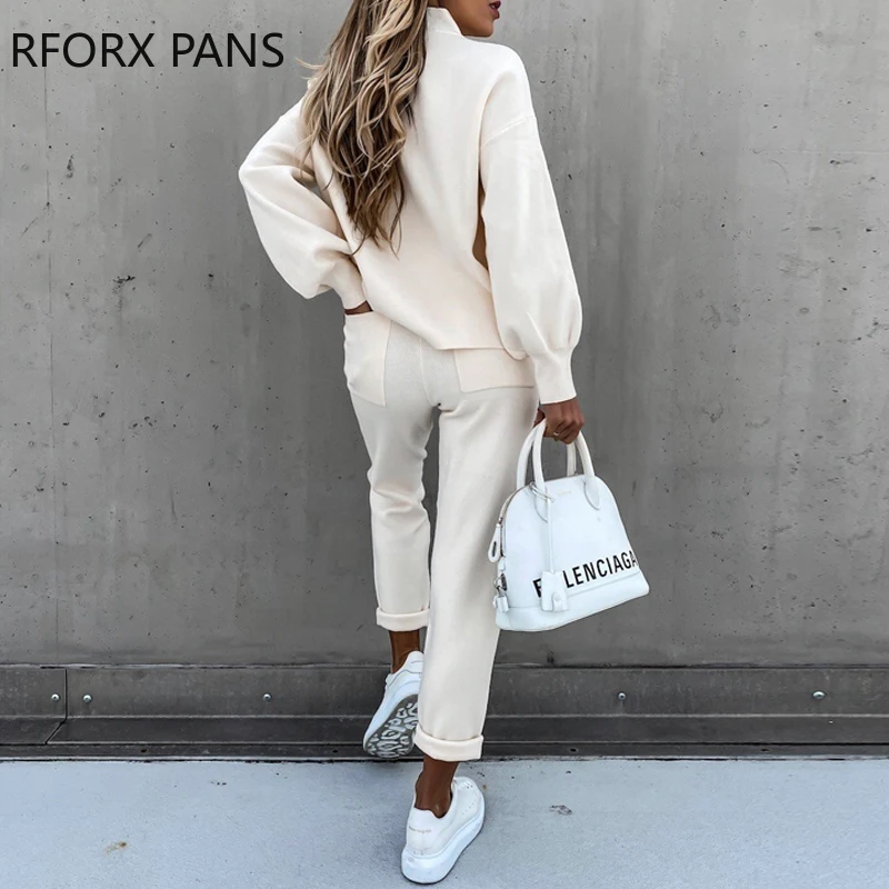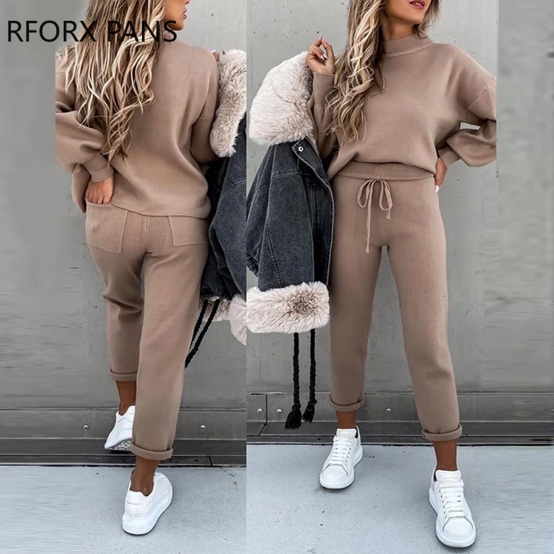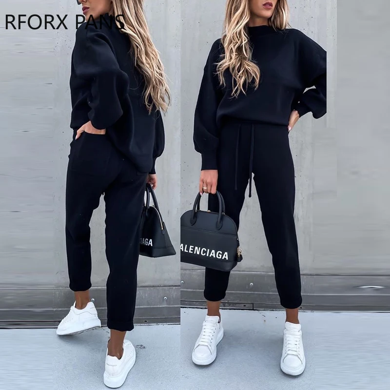 Yipinpay Women Solid Lantern Sleeve Top & Drawstring Pockets Design Pants Set Casual Women Sets