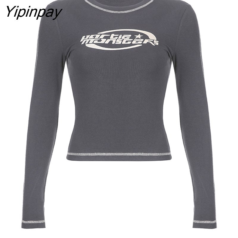 Yipinpay Women T-Shirt Slim Crop Top Retro Elastic Pullovers Korean Fashion Print Grunge Vintage Long Sleeve Tee Y2k Streetwear Clothing