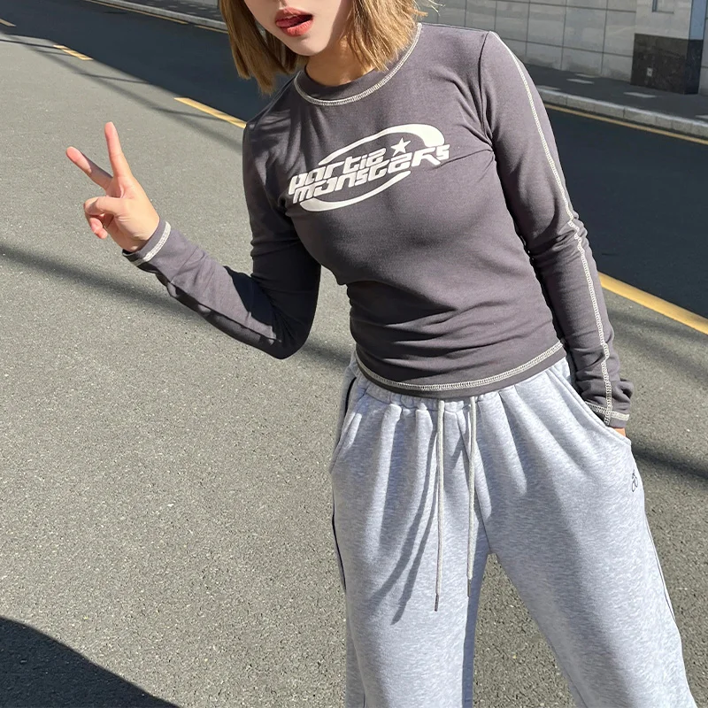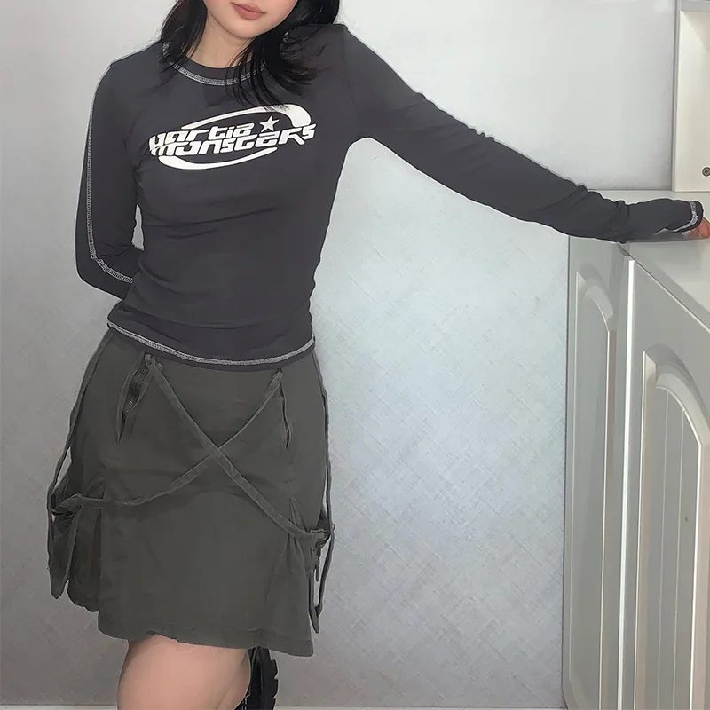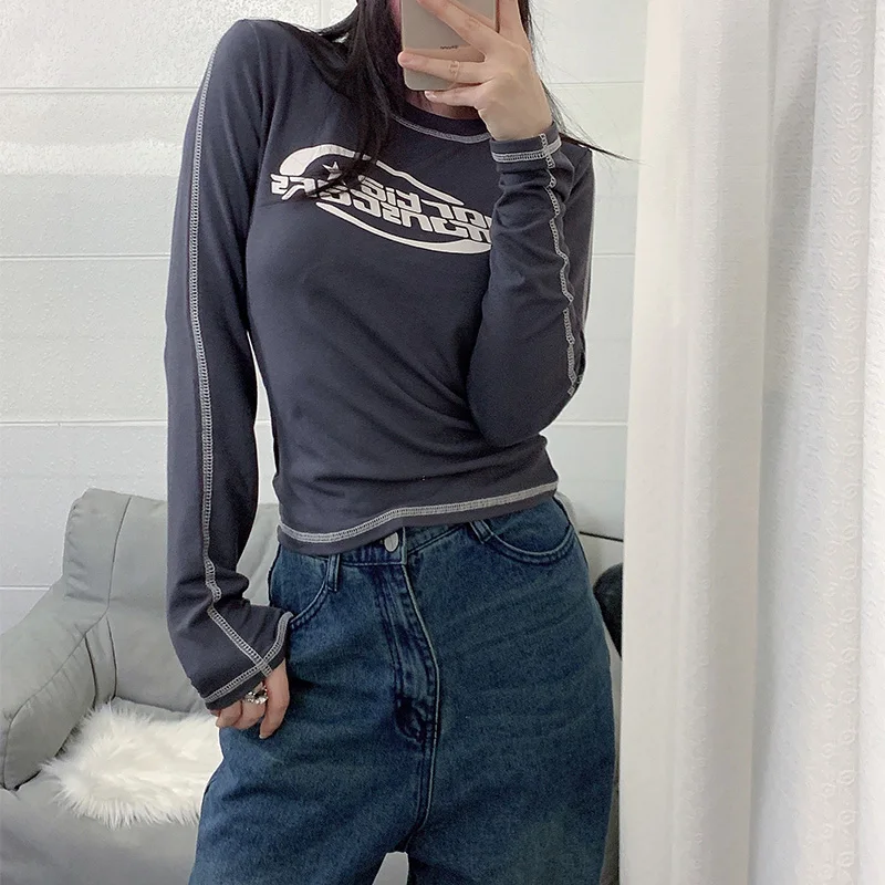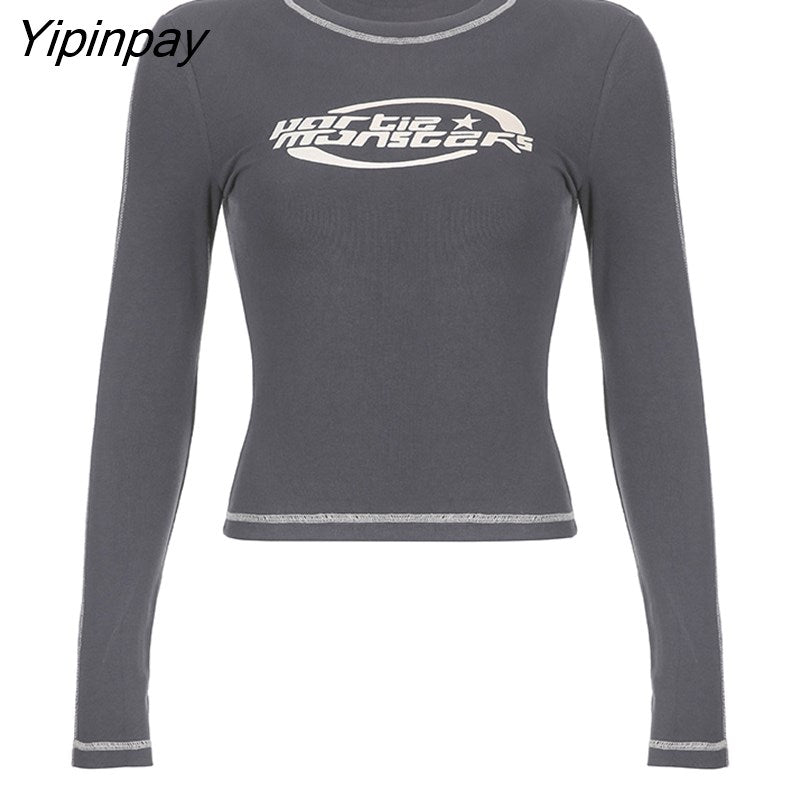Yipinpay Women T-Shirt Slim Crop Top Retro Graphic Pullovers Korean Fashion Print Grunge Vintage Long Sleeve Tee Y2k Streetwear Clothing