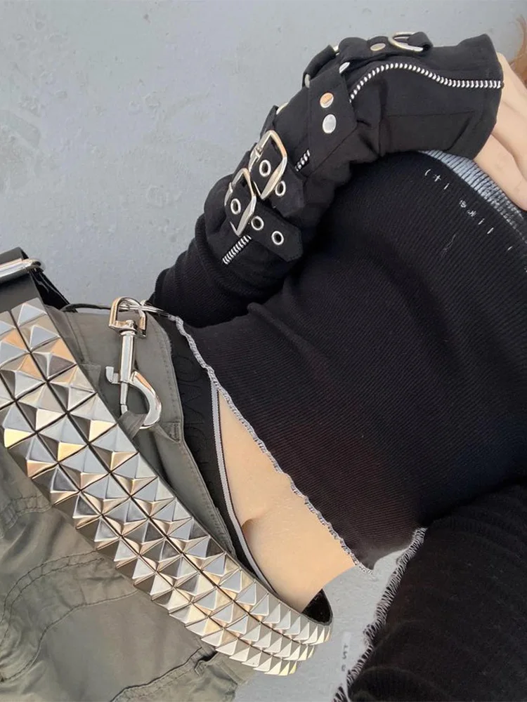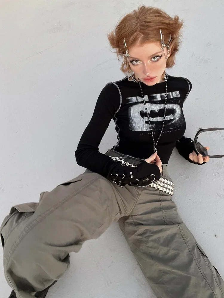 Yipinpay Women T-Shirt Y2k Black Rib Crop Top Long Sleeve Slim Skull Grunge Tees Korean Fashion Gothic Graphic Streetwear Vintage Clothes