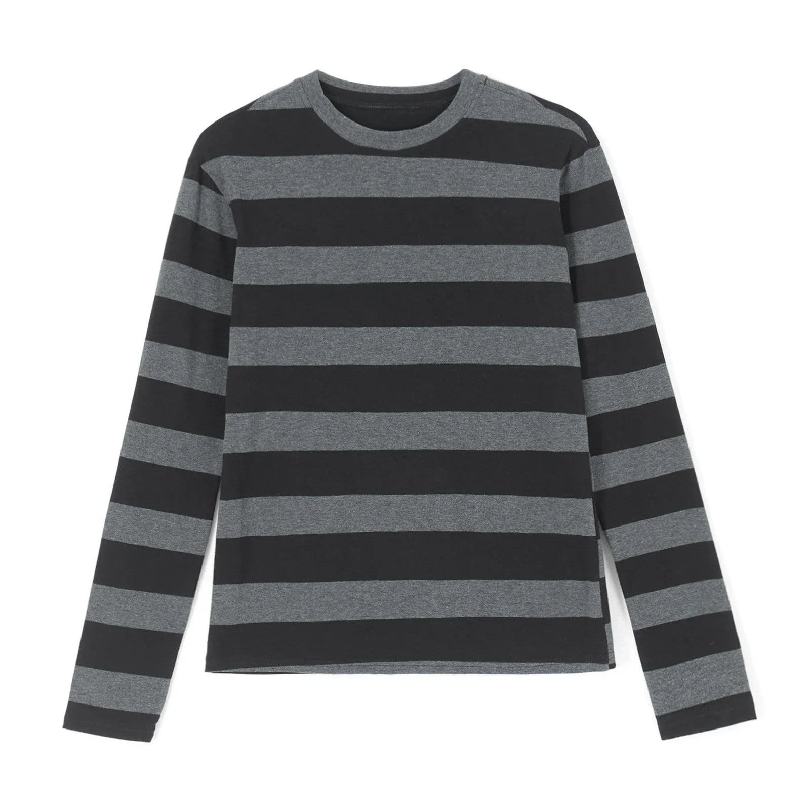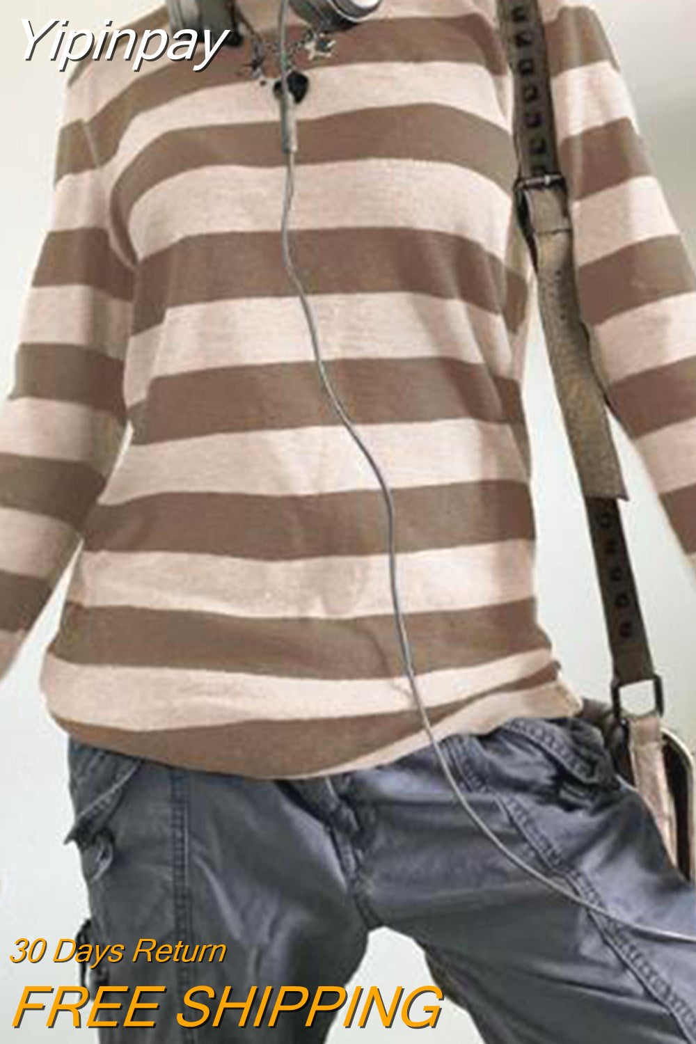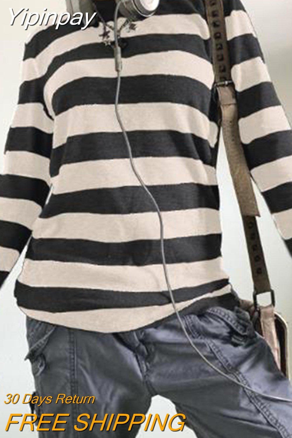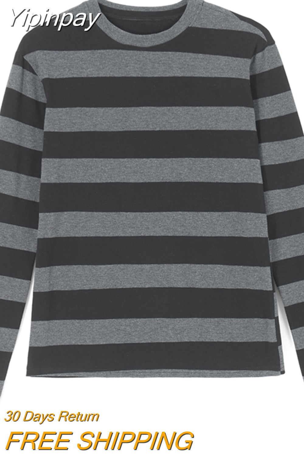 Yipinpay Women Y2K 2000s Retro Knit Basic Tee Shirt Casual Grey Black Striped Long Sleeve Round Neck Tops Club Streetwear