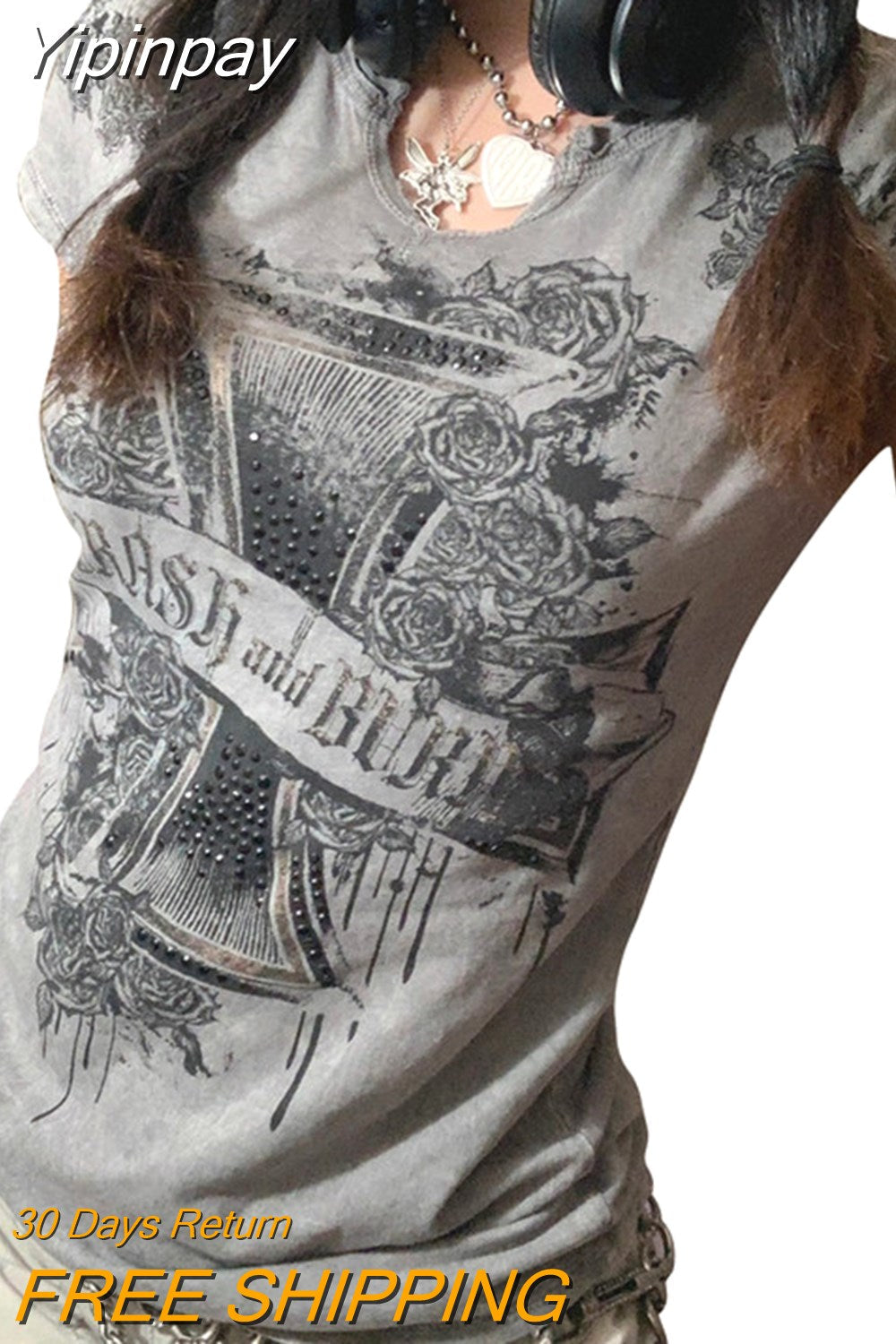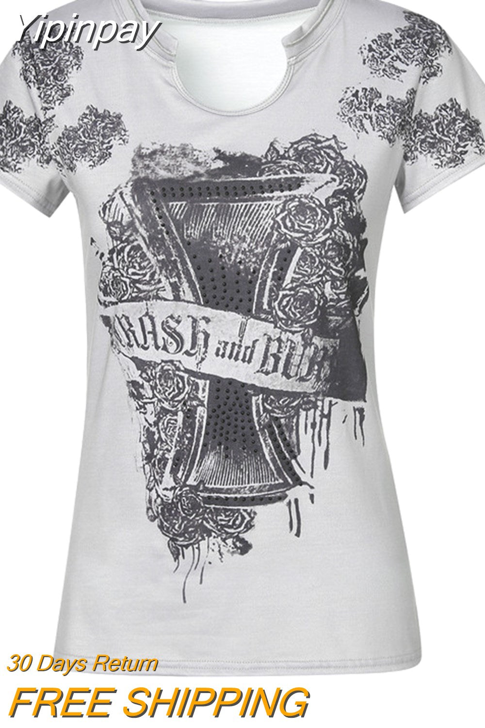 Yipinpay Women y2k Clothes Tops Summer 2023 T-shirts Grunge 2000s Trashy Vintage Aesthetic Short Sleeve Tees Young Girls Streetwear
