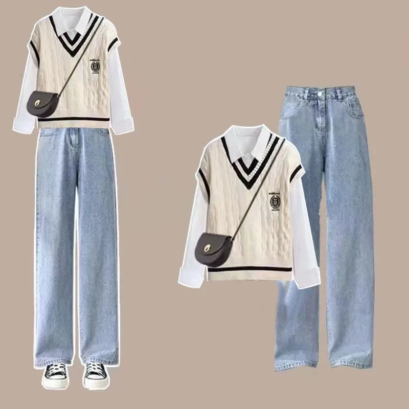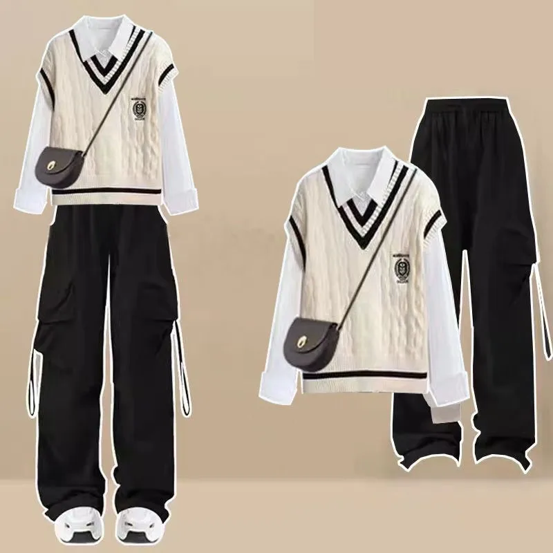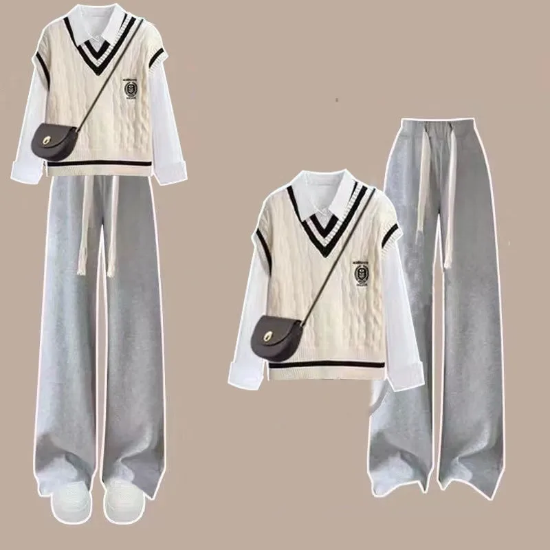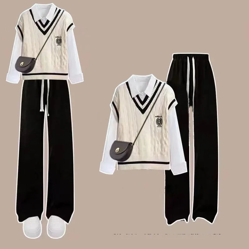 Yipinpay Women's 2024 Spring New Fashion Long Sleeve Shirt+Knitted Vest+Casual Pants Three Piece Korean Elegant Trousers Matching Set
