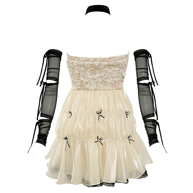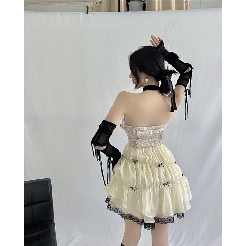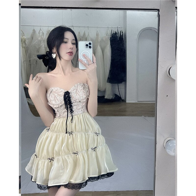 yipinpay Women's Clothing Tube Top Dress Bow Lacing Sleeveless French Casual Sexy High Waist Self Cultivation Short Skirt Ladies Summer