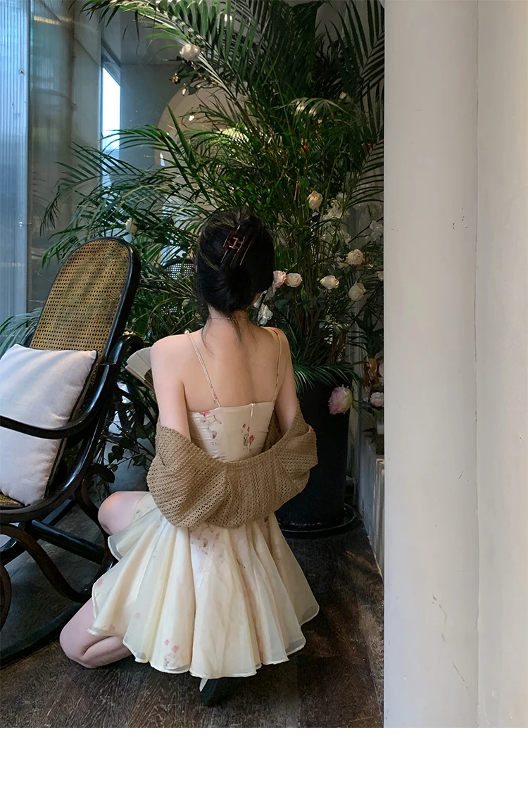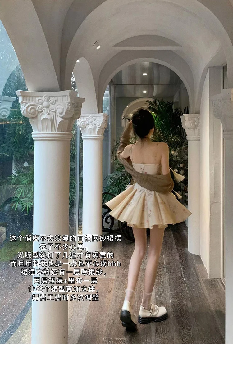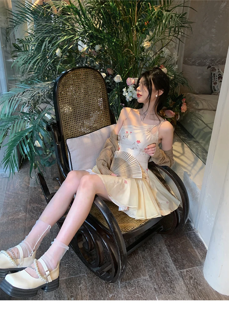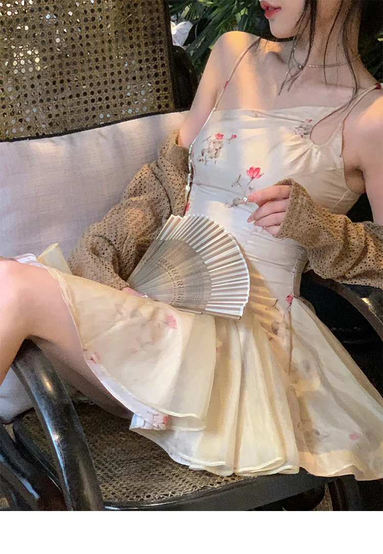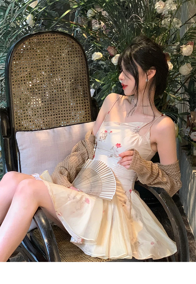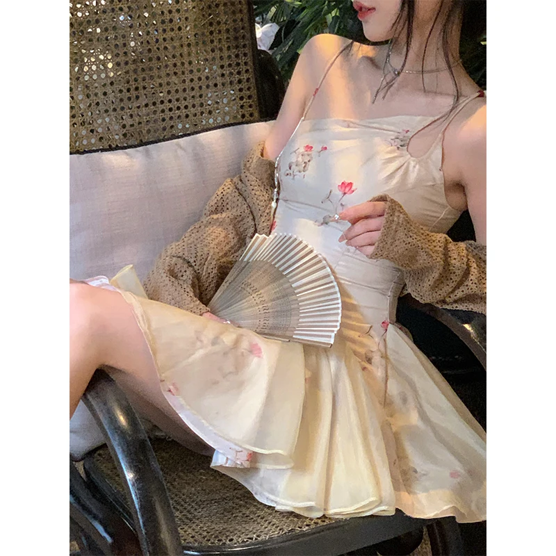 yipinpay Women's Dress Apricot Short Skirt Summer New Chinese Style Fashion Suspender Dress Women's Design Dress Ball Gown Short Skirt
