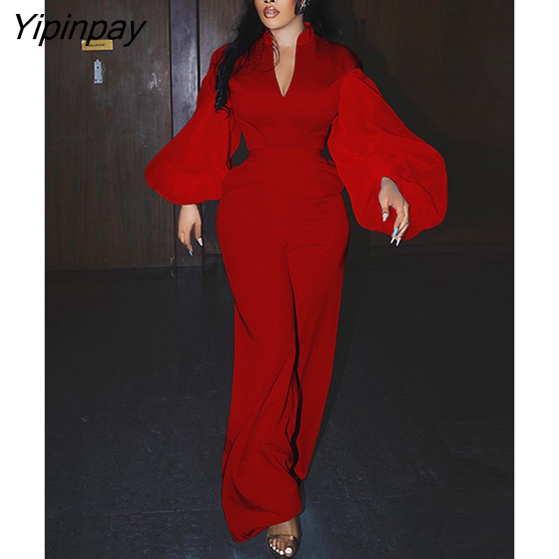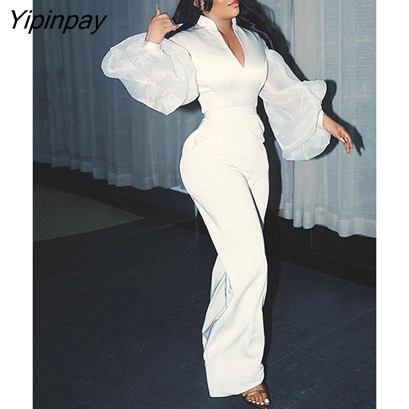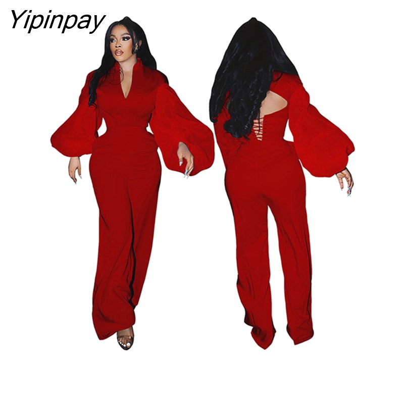 Yipinpay Women's Elegant Gauze Lantern Sleeve Bandage Tops Pants Two Piece Set 2023 Lady Fashion Backless Blouse Wide Leg Trousers Suits