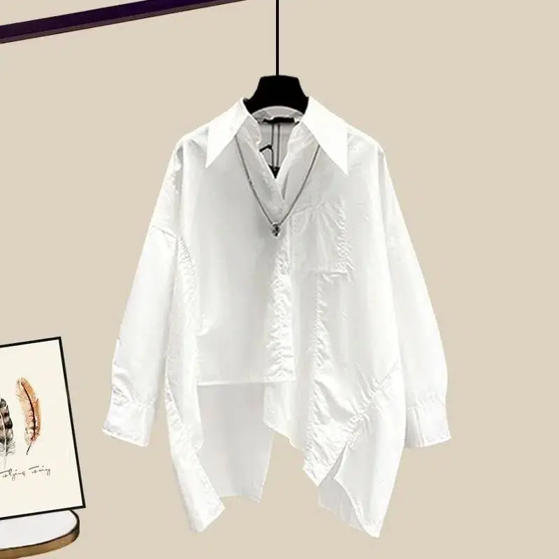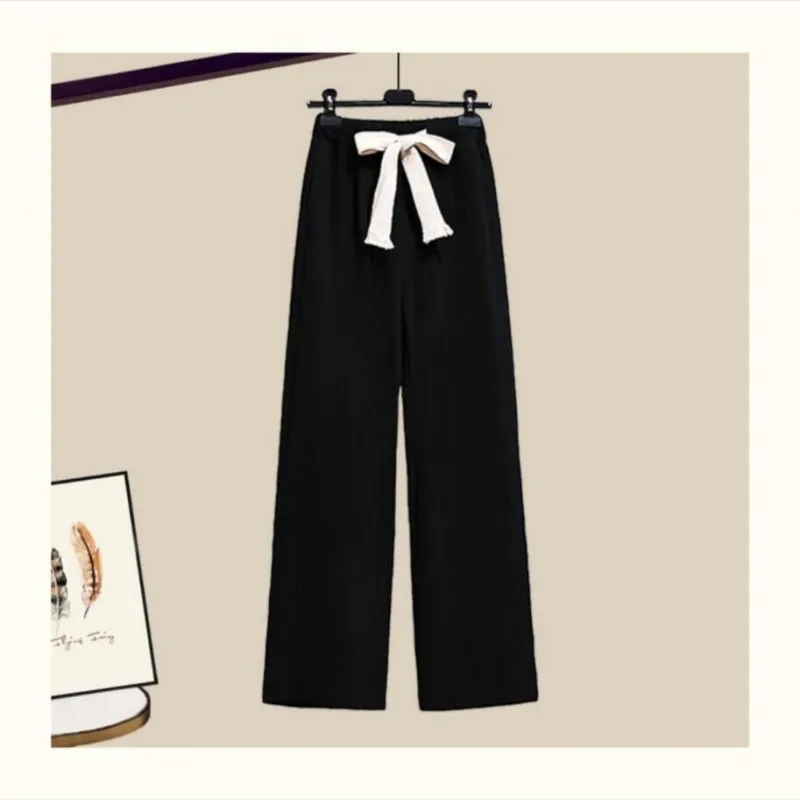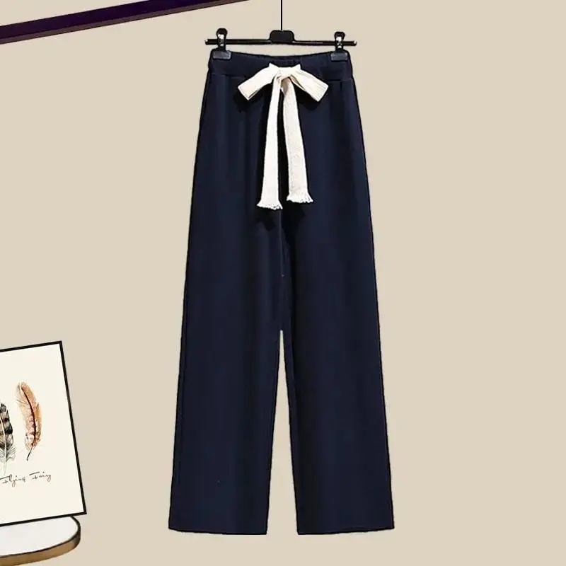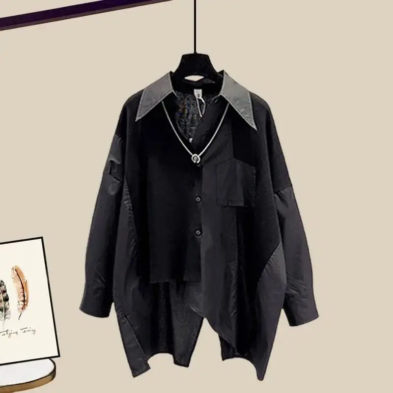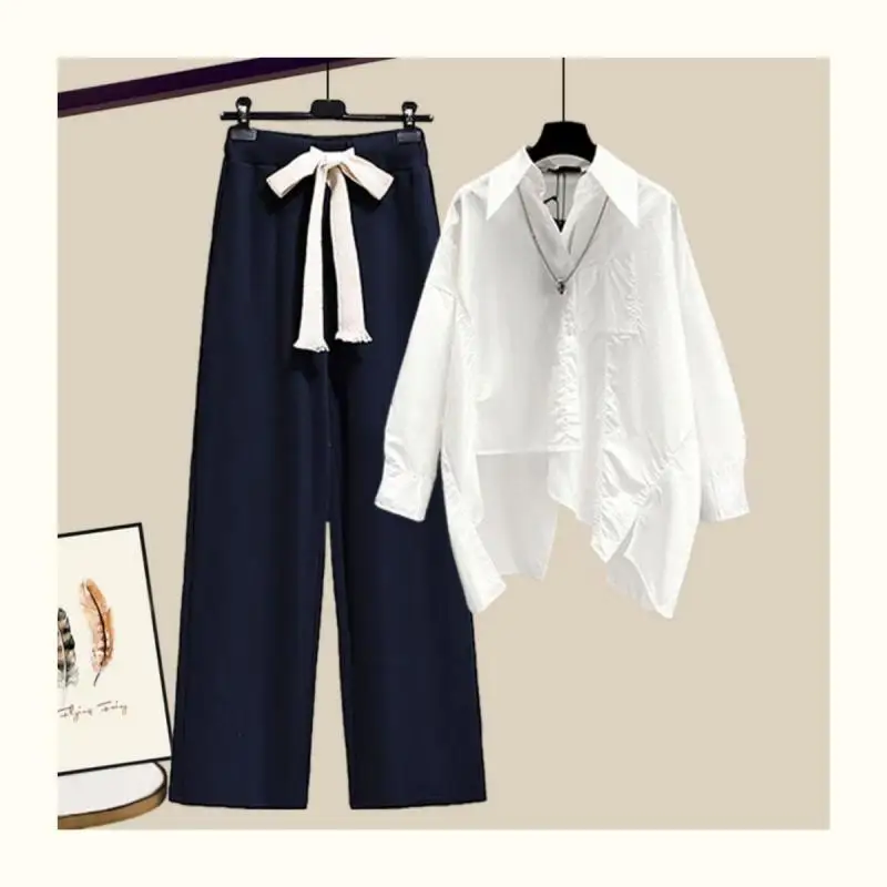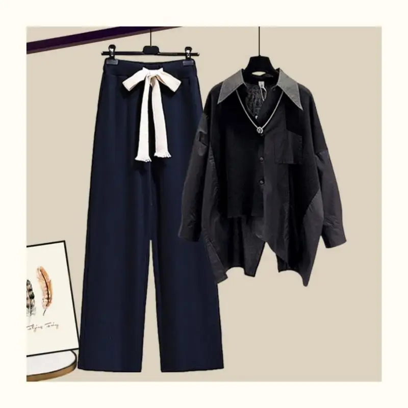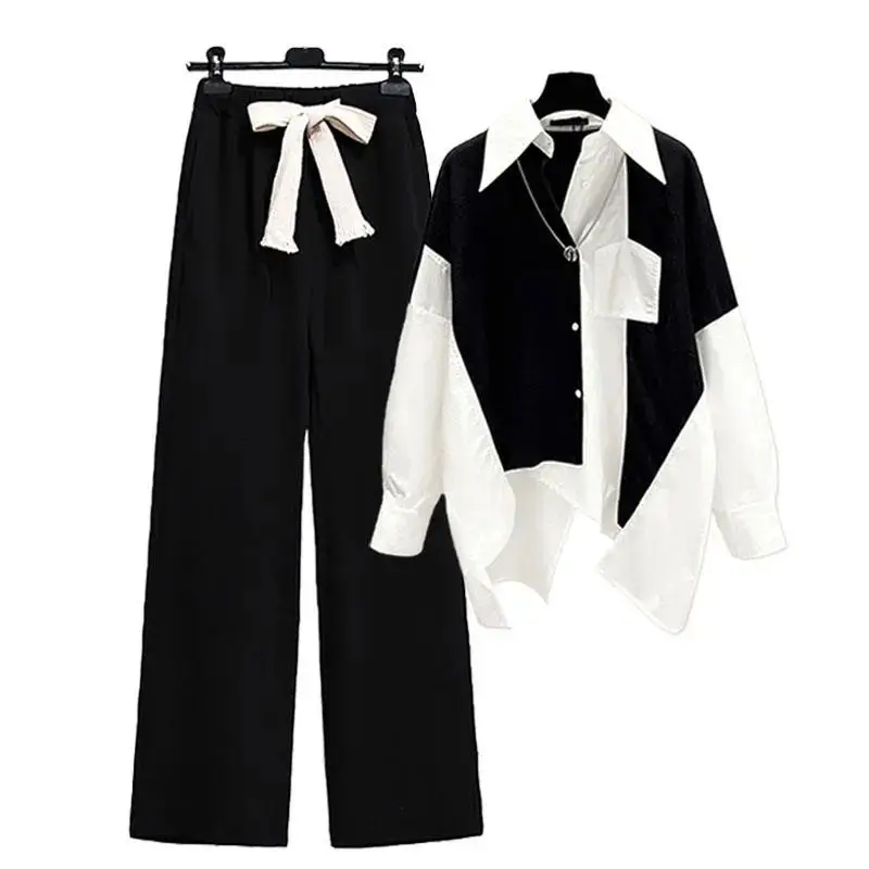 Yipinpay Women's Fashion Set 2024 Spring Autumn New Splicing Shirt+Elastic Waist Wide Leg Pants Two Piece Korean Chic Blouse Trouser Suit