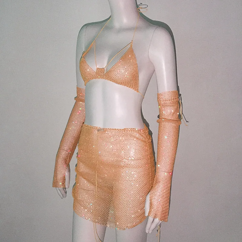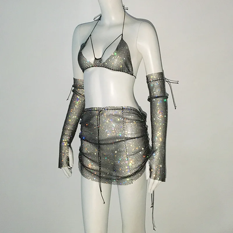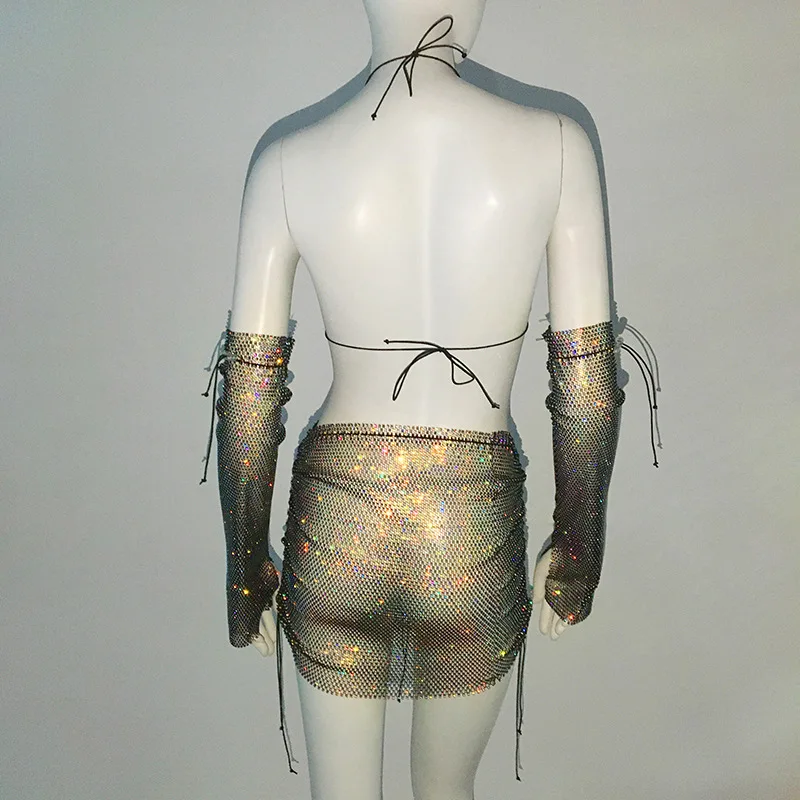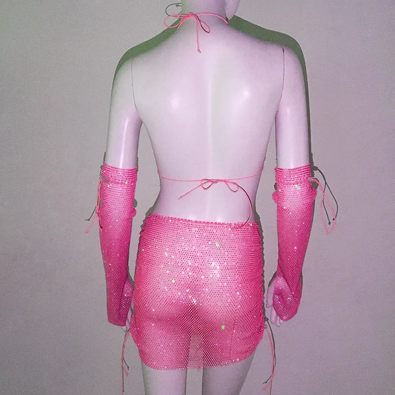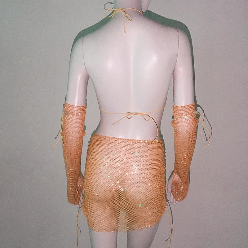 Yipinpay Women's Set Fishnet Rhinestone Dress Halter And Skirt And Arm Cuff Dress Lady's Temperament Elegant Three-Piece Outfits
