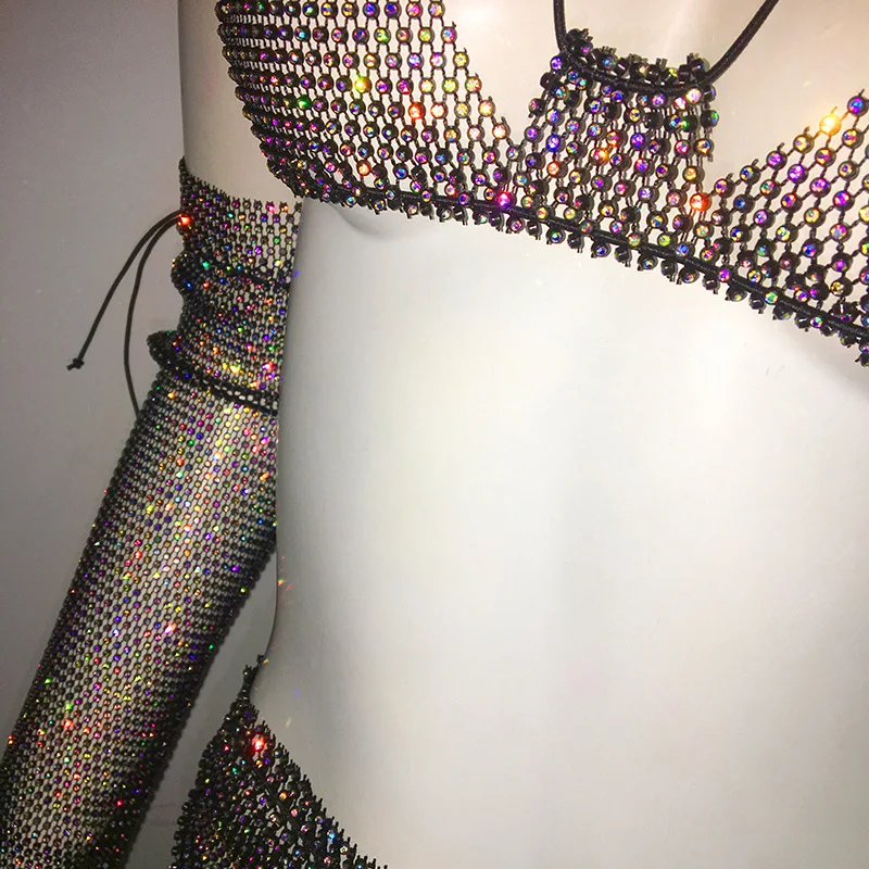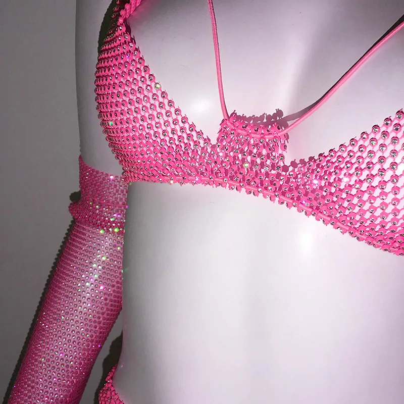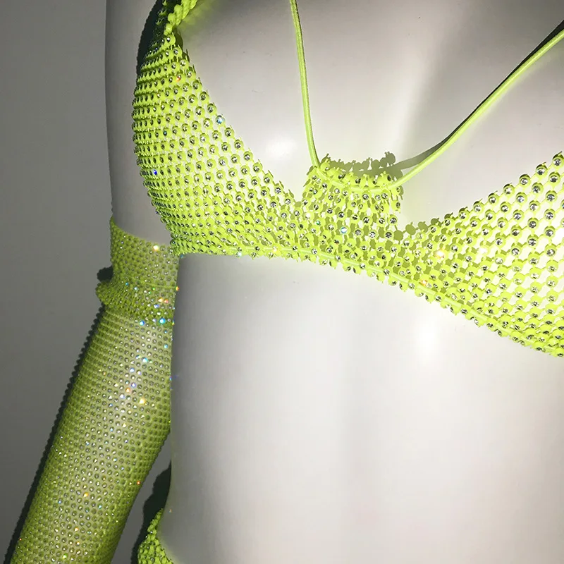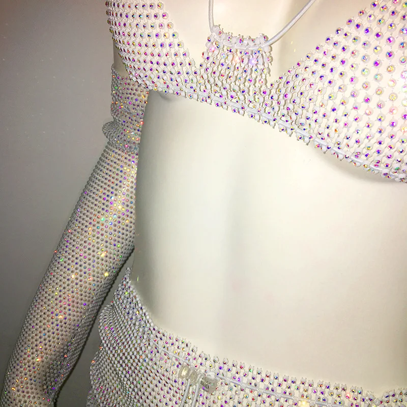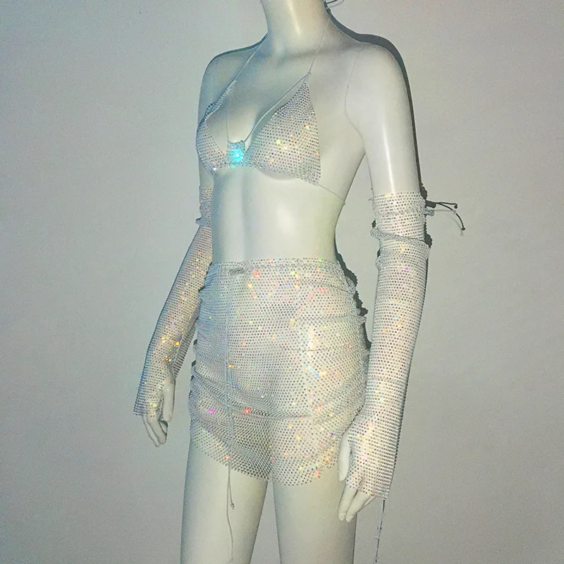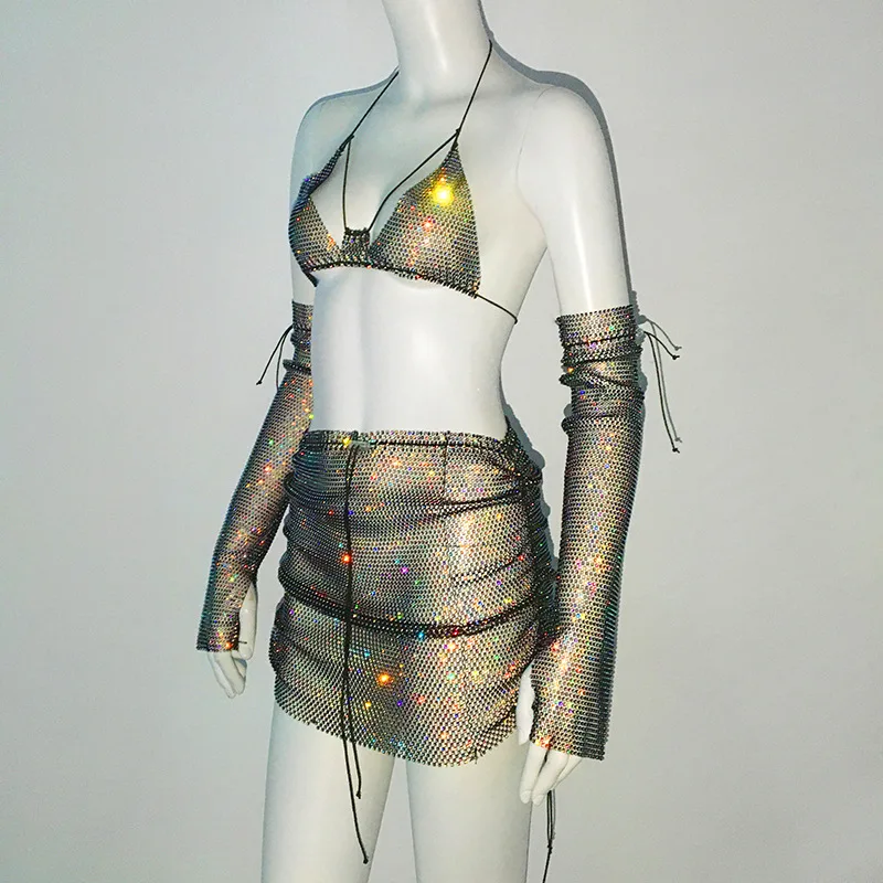 Yipinpay Women's Set Fishnet Rhinestone Dress Halter And Skirt And Arm Cuff Dress Lady's Temperament Elegant Three-Piece Outfits