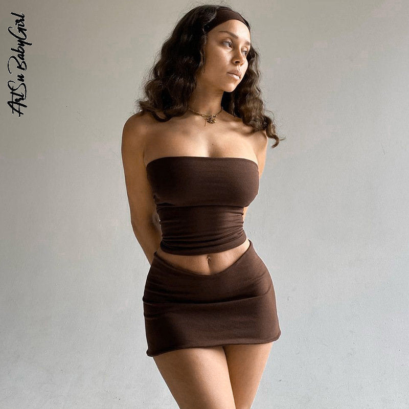 yipinpay Women's Set Strapless Crop Tops Festival Outfit Mini Skirts Women Clothes Solid Color Y2k Streetwear Knitted Dresses Sets