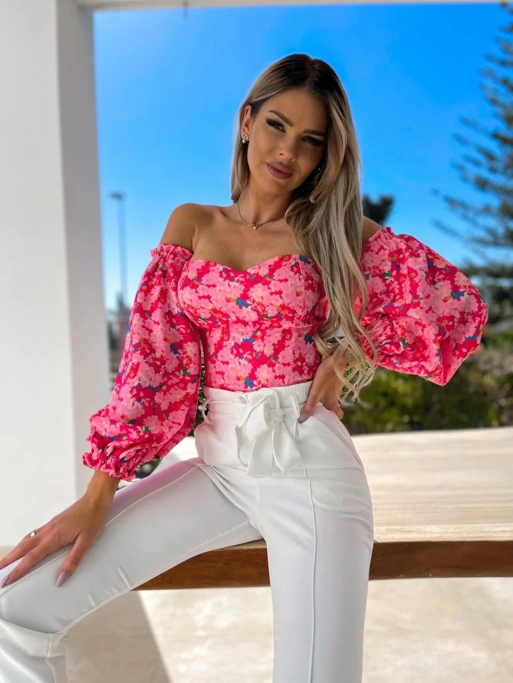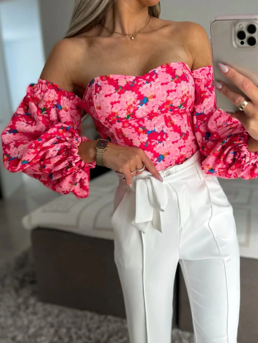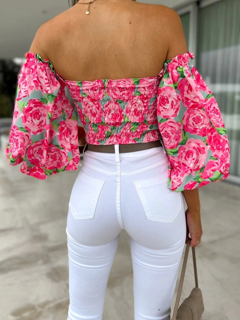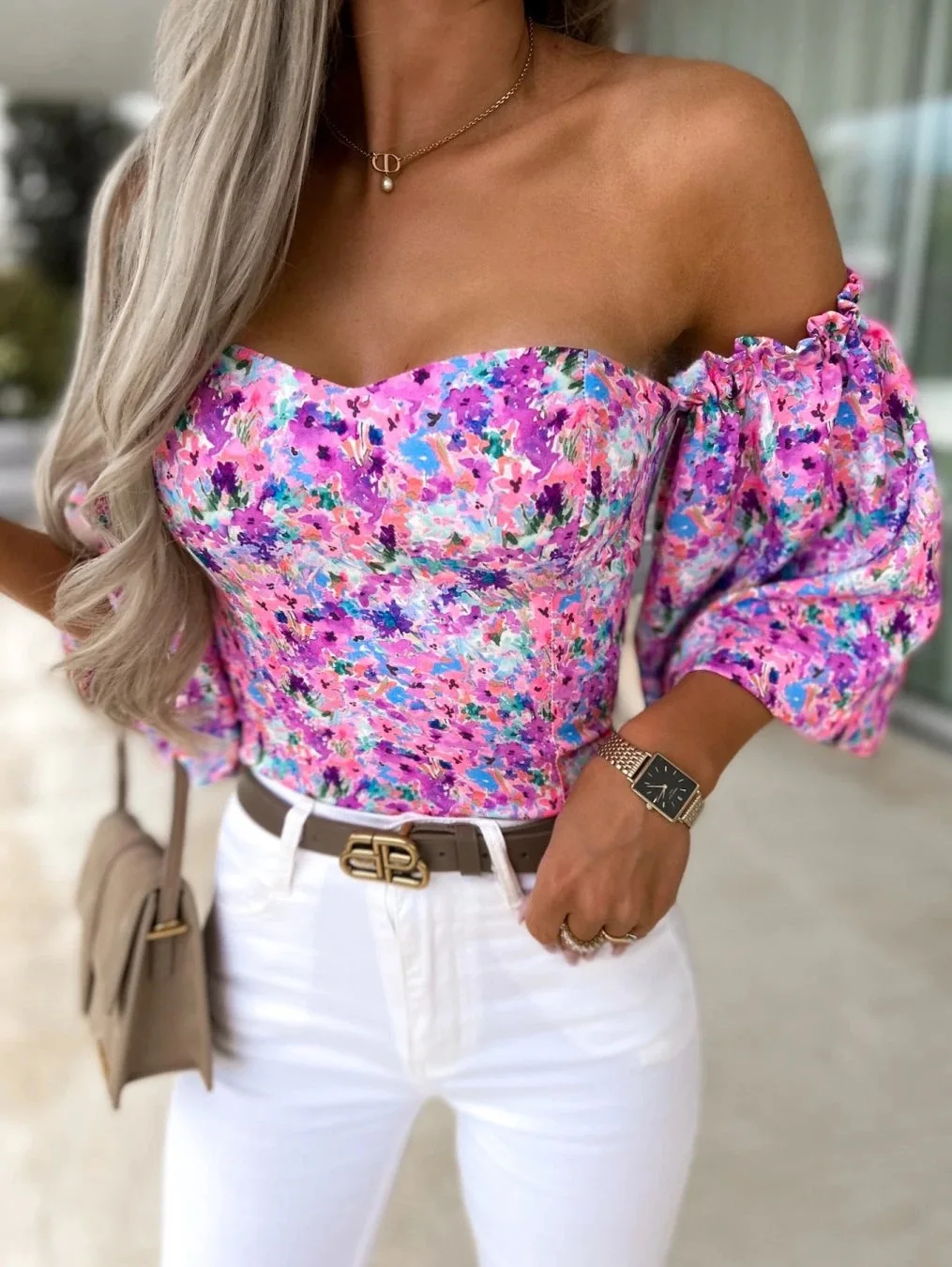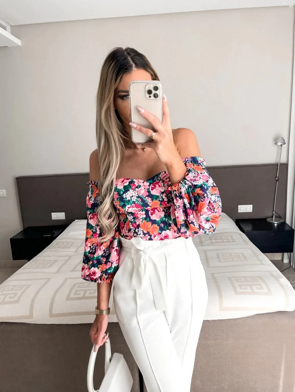 Yipinpay Women's Sexy Shirt 2024 Off Shoulder Floral Blouses Women Boho Fashion Backless Blouse Female Holiday Folds Tops Clothing