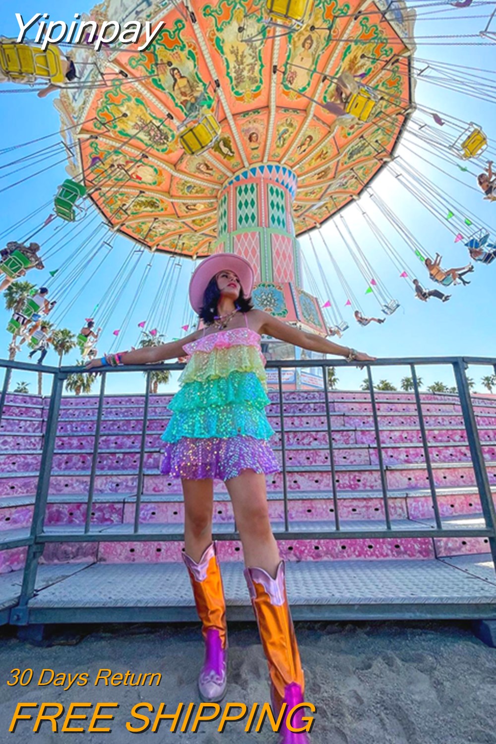 Yipinpay Womens Sleeveless Colorful Dress Shiny Sequins Decoration Spaghetti Strap Party Club Mini Tiered Dress Street Style Fashion