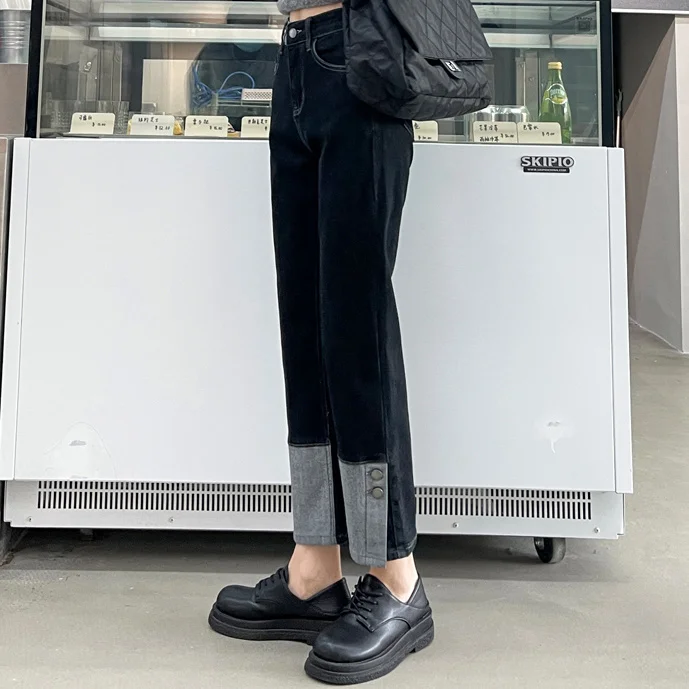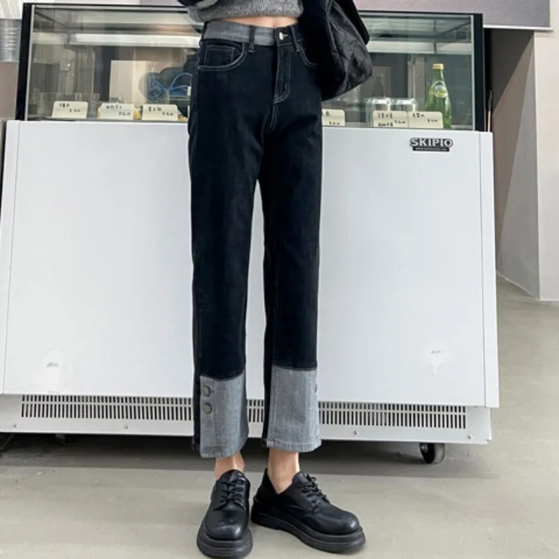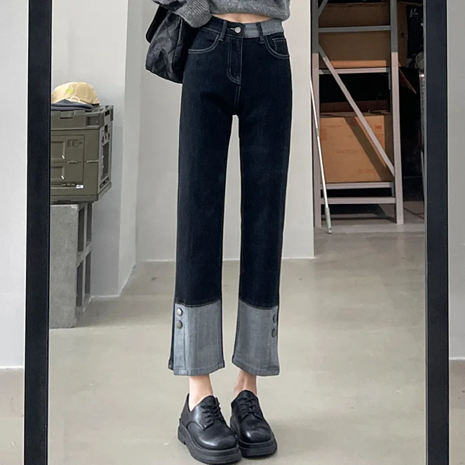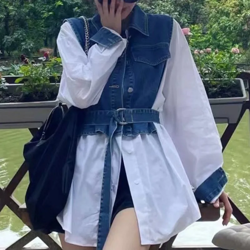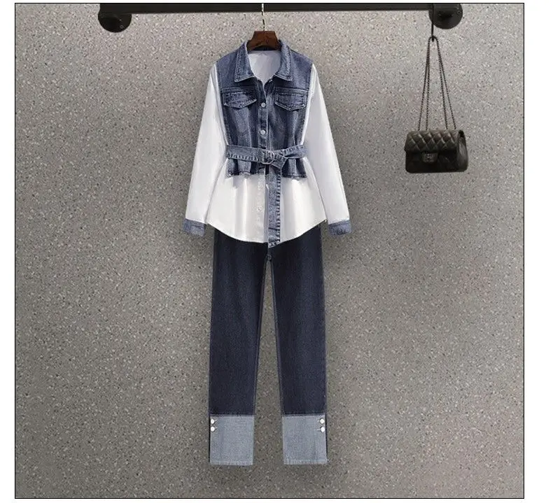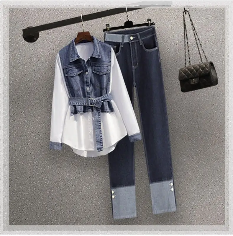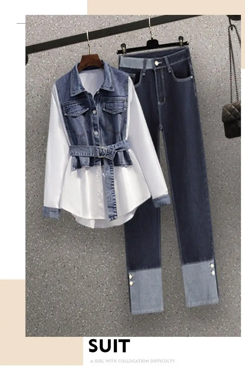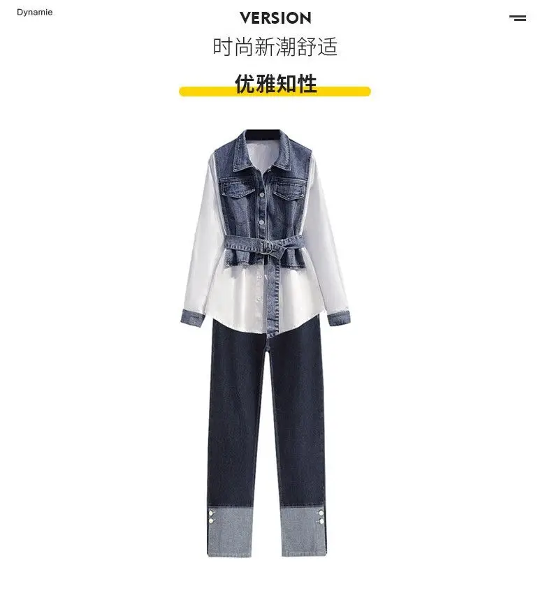 Yipinpay Women's Spring New Casual Blouse Denim Pants Matching Set 2024 Korean Elegant Chic Fake Two Piece Long Sleeved Top Jeans Suit