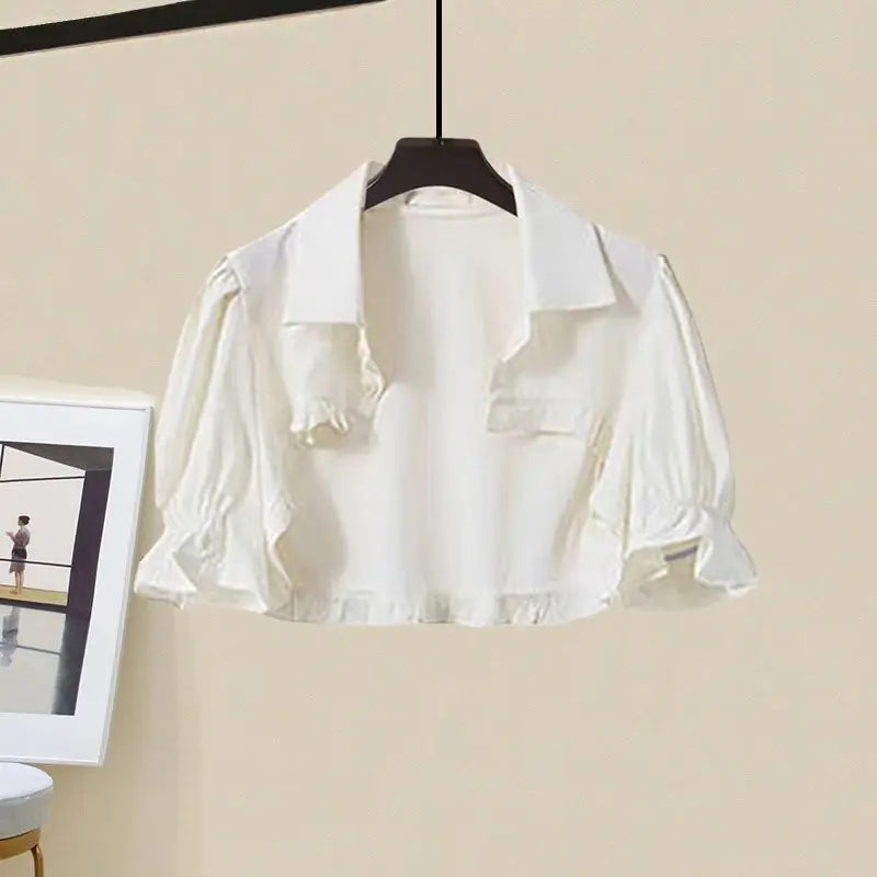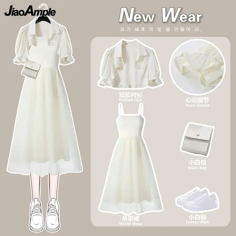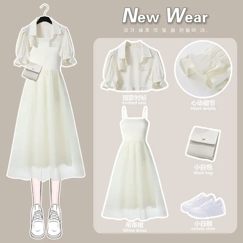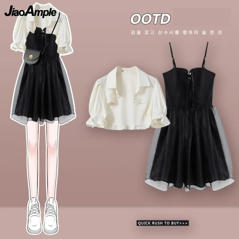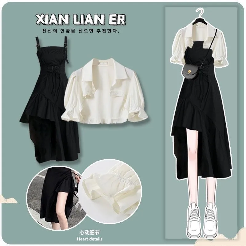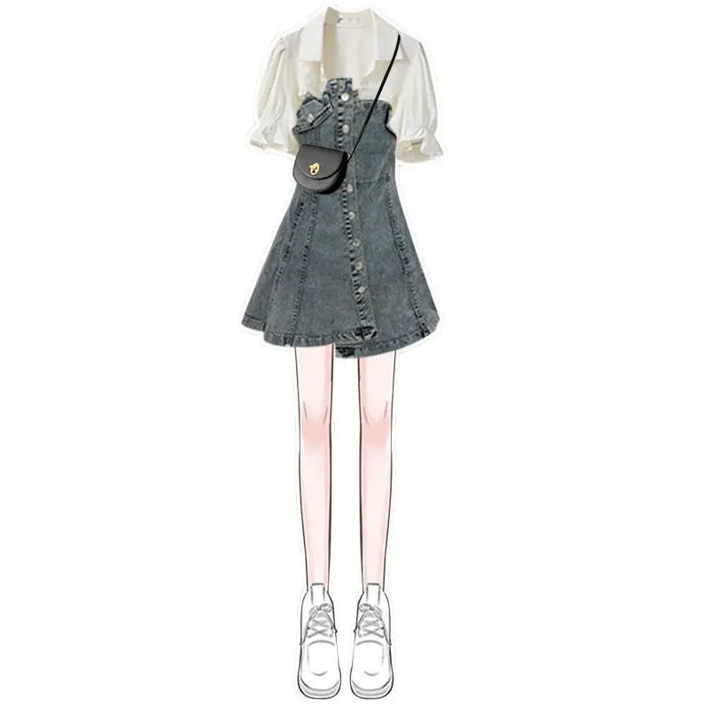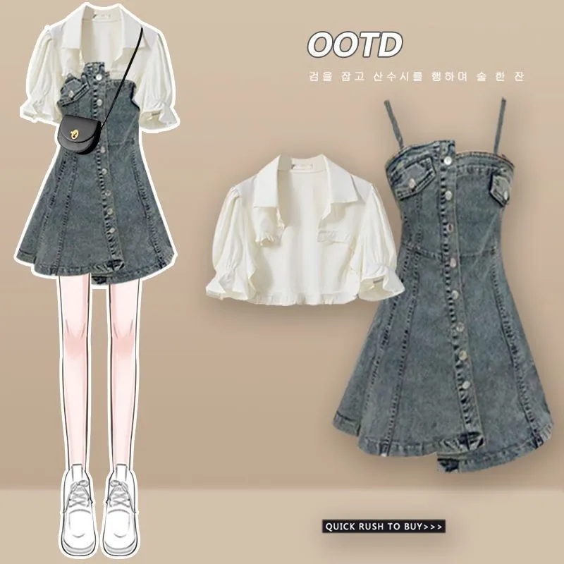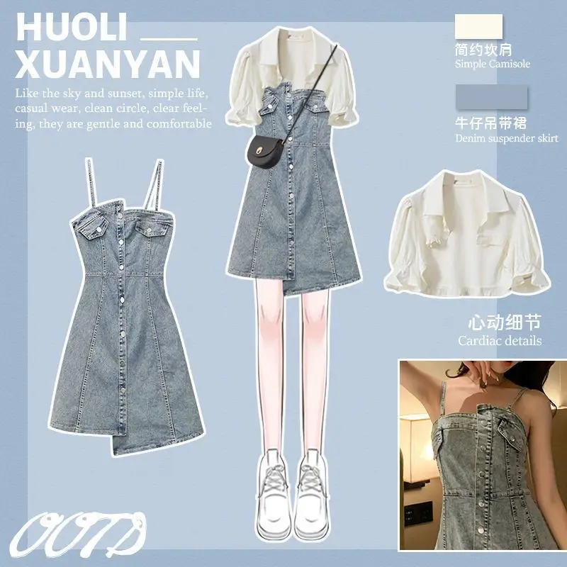 Yipinpay Women's Summer Dress Suit 2024 New Fashion Short Sleeve Shirt+Denim Strap Skirt Two Piece Korean Elegant Casual Matching Set