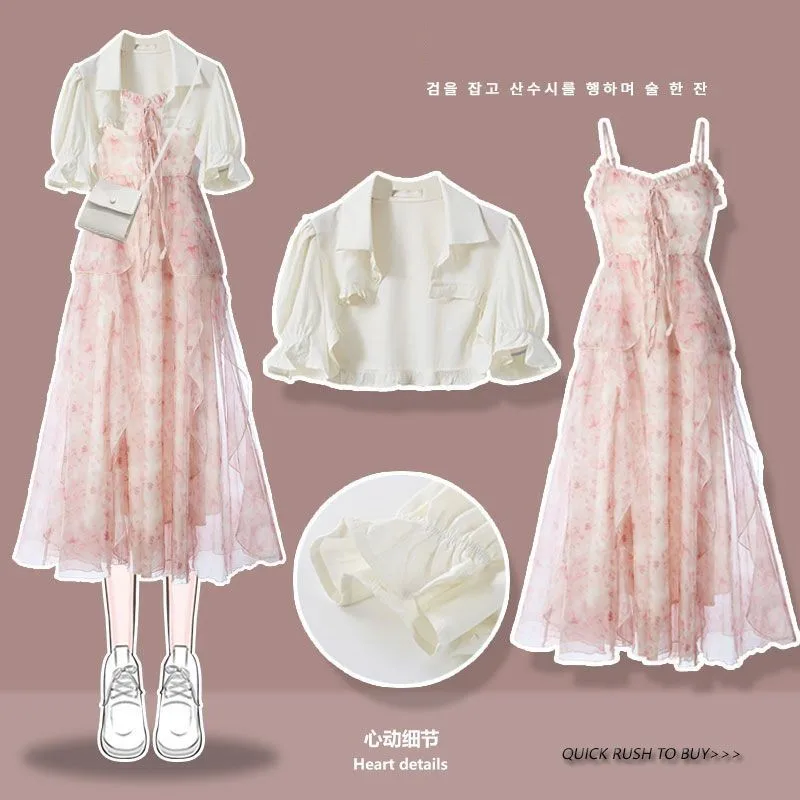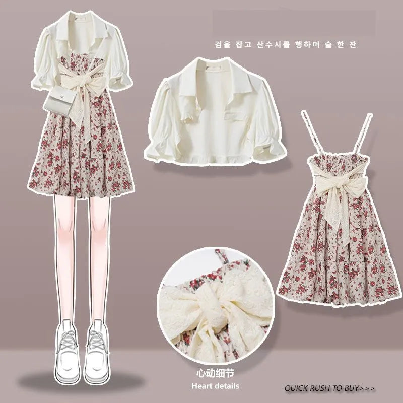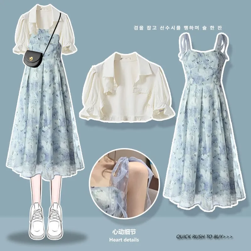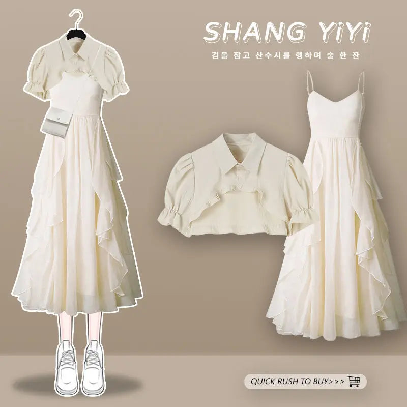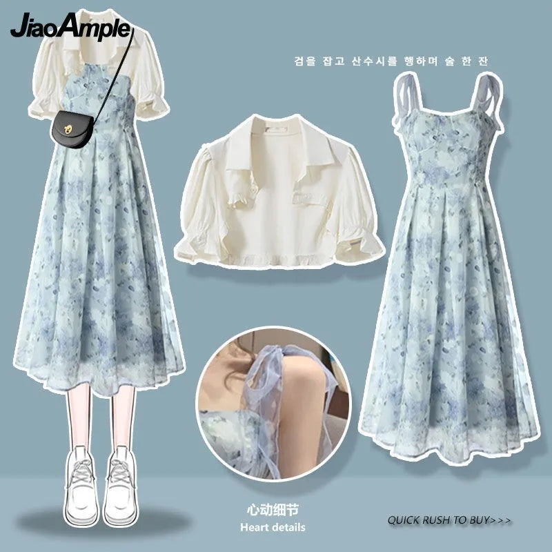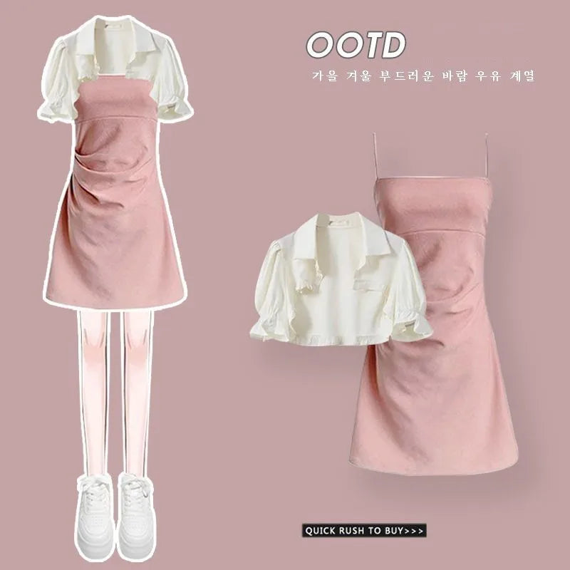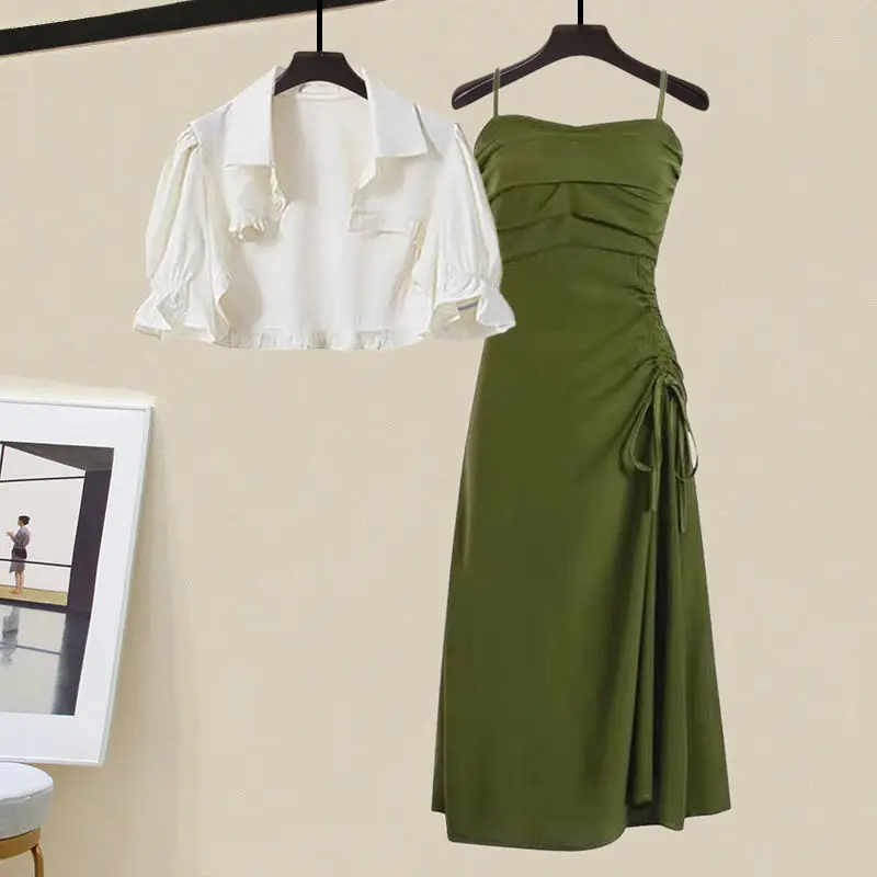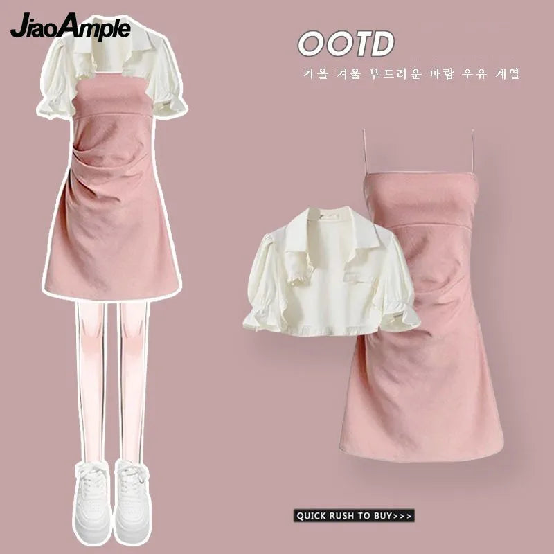 Yipinpay Women's Summer Dress Suit 2024 New Fashion Short Sleeve Shirt+Denim Strap Skirt Two Piece Korean Elegant Casual Matching Set