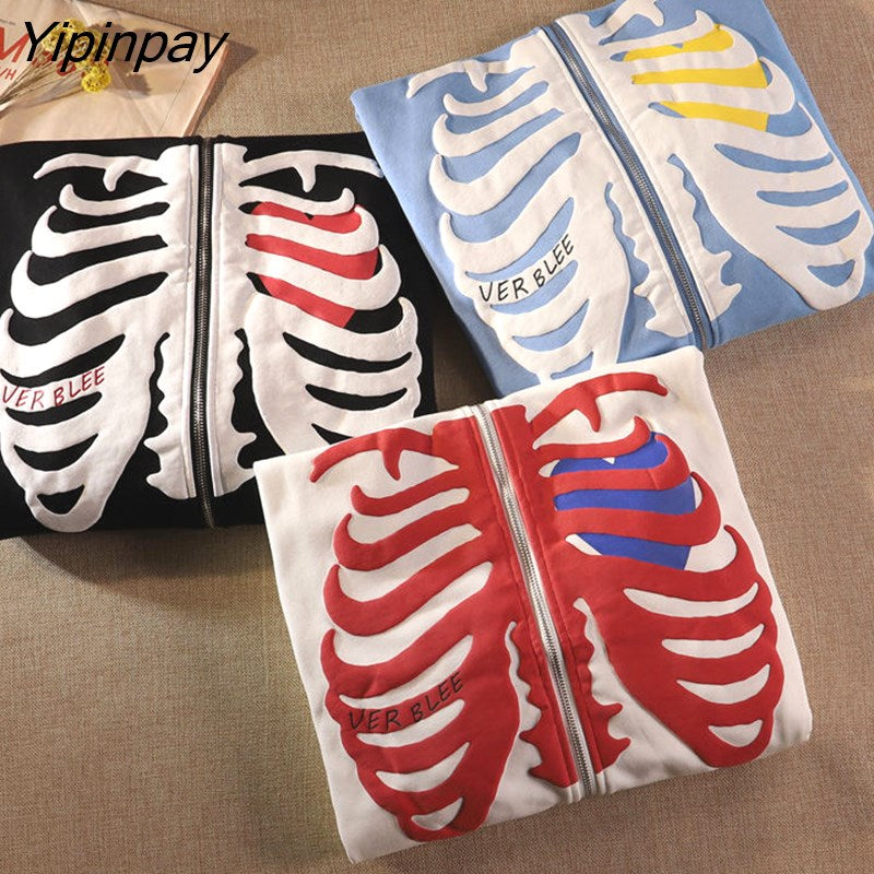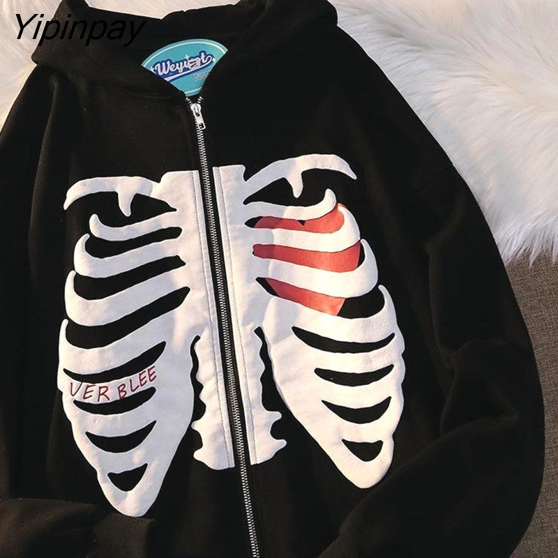 Yipinpay Women's Sweatshirt Skelet Printing Streetwear Oversized Zip Hoodie Long Sleeve Top Harajuku Korean Cardigan Jackets Goth Clothes