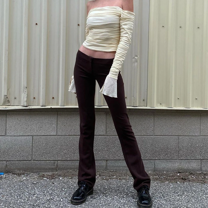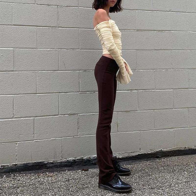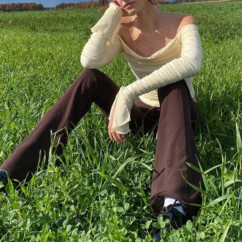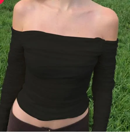 Yipinpay Women's T-shirt Off-the-shoulder Chic Solid Color Long Sleeve Ruched Pleated Mesh Crop Tops Casual Fashion Slim Tee Y2k