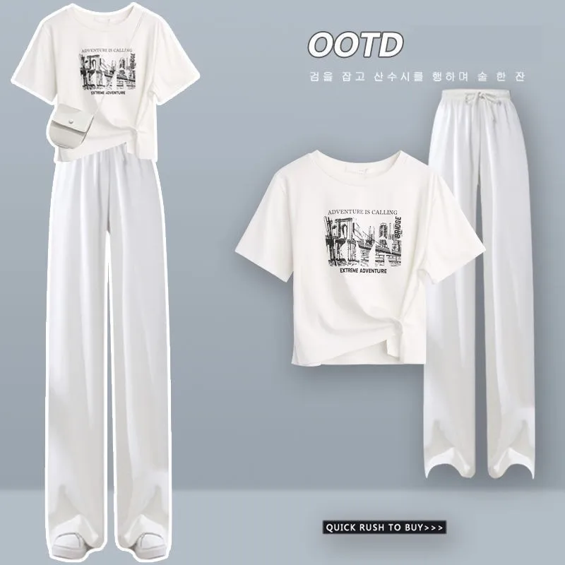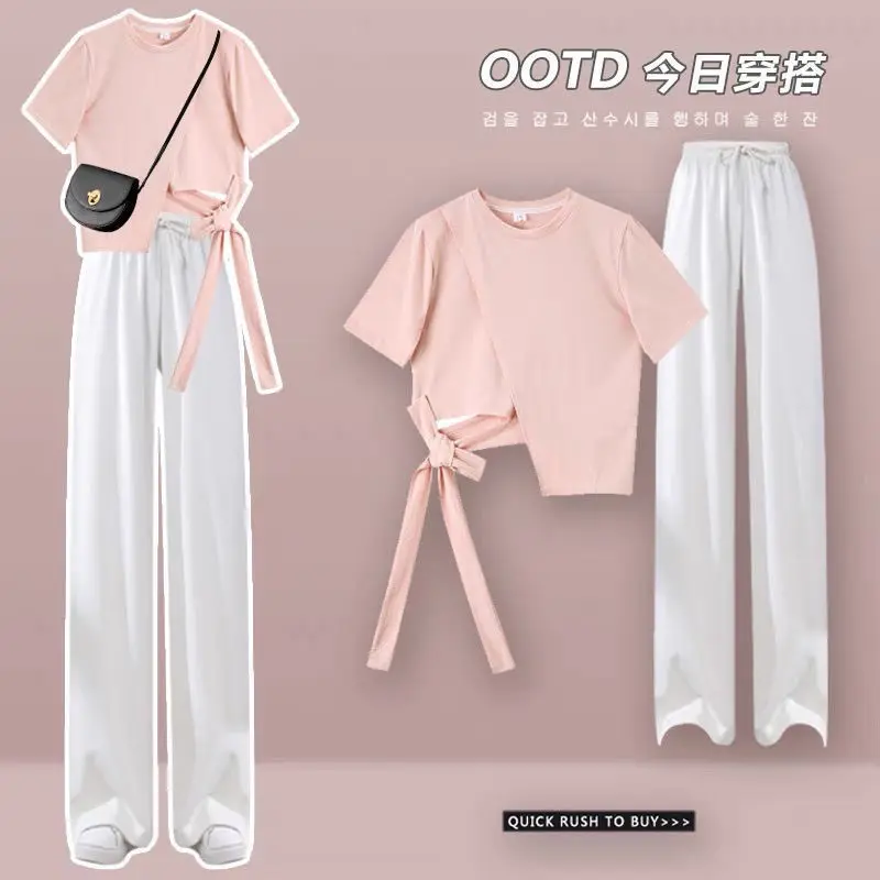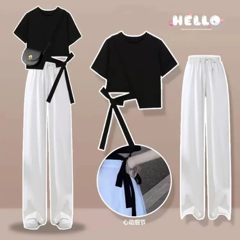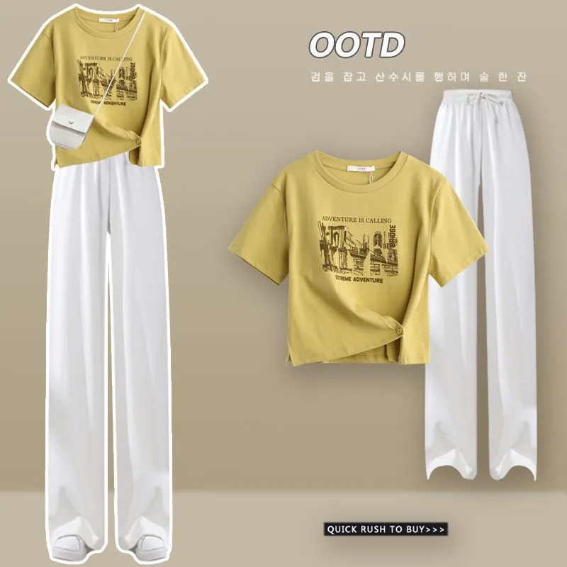 Yipinpay Women's Tracksuit 2024 New Fashion Short Sleeve Top+Wide Leg Pants Two Piece Korean Elegant Summer Matching Set Female Clothing
