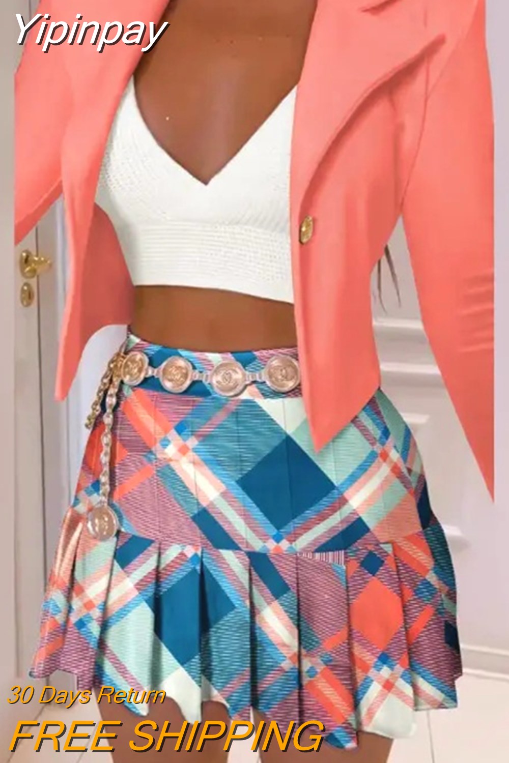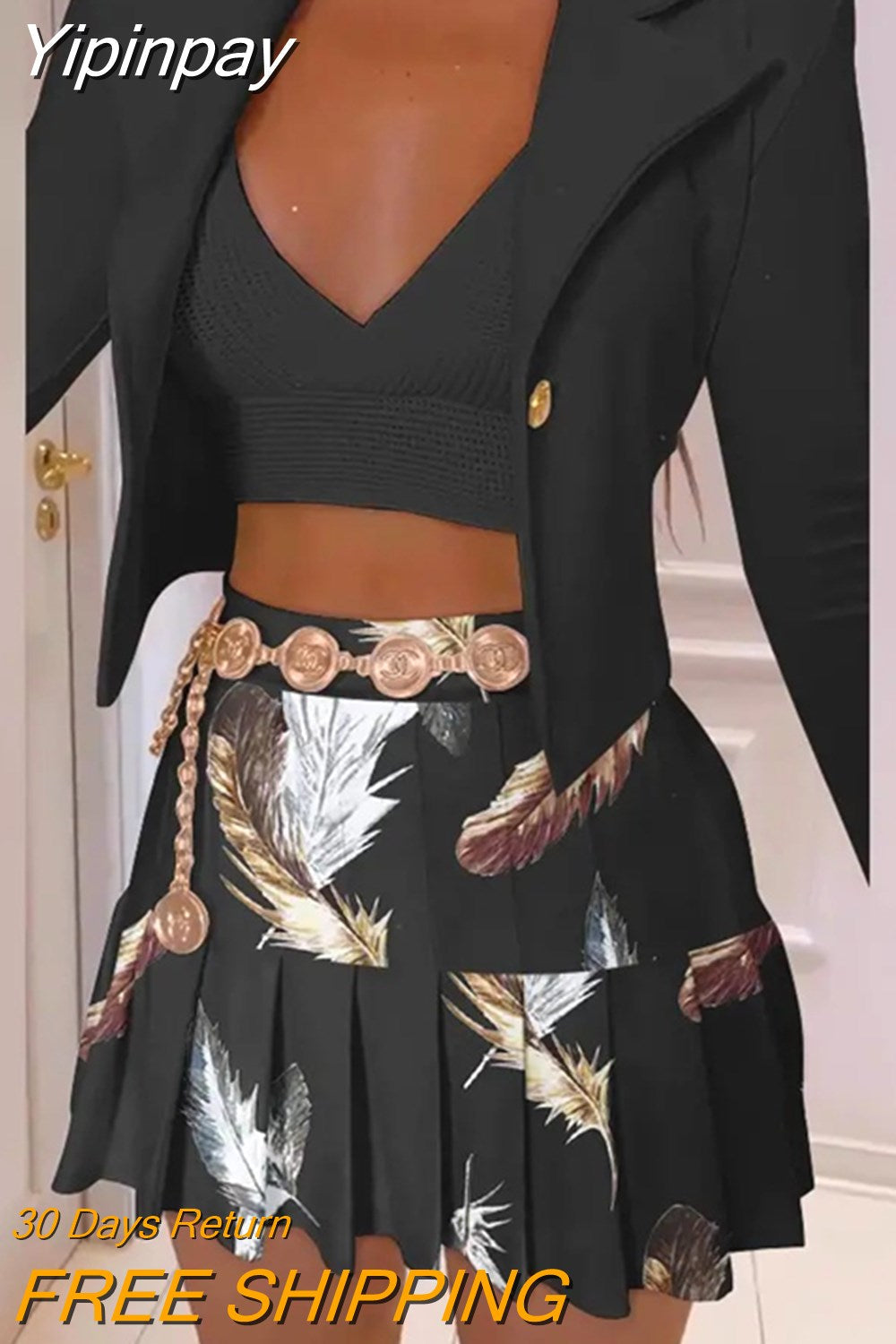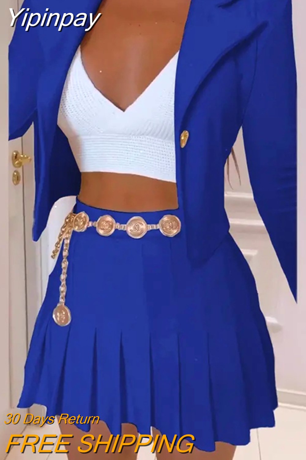 Yipinpay women's two piece set Buttoned Long Sleeve Blazer Coat Chain Decor Pleated Skirt Set short skirt suit female 2023 new