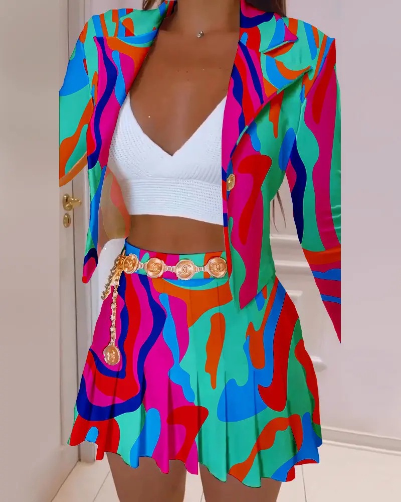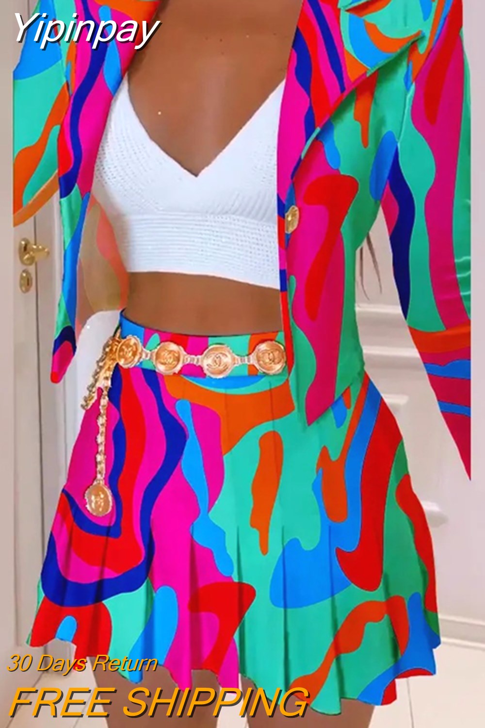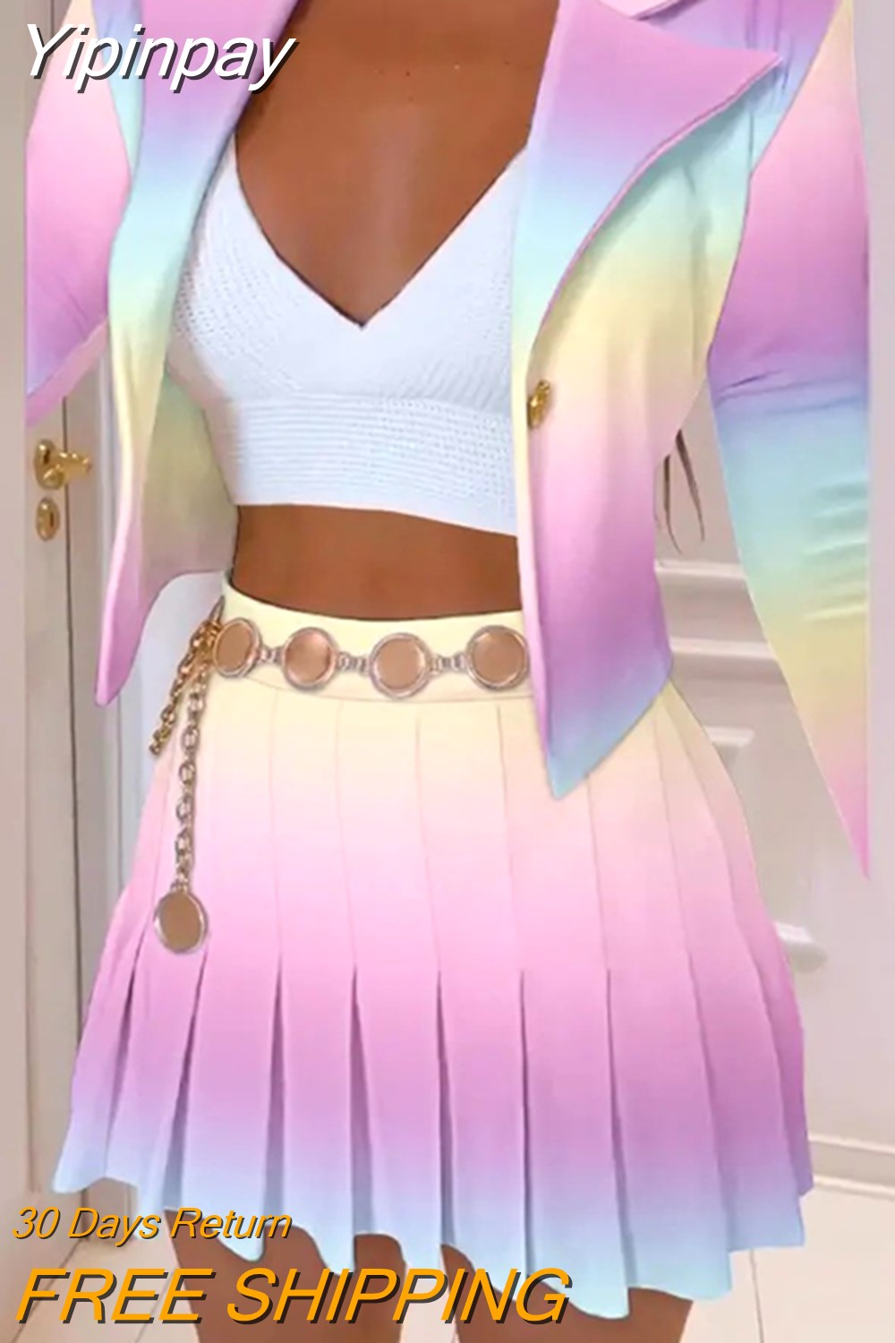 Yipinpay women's two piece set Buttoned Long Sleeve Blazer Coat Chain Decor Pleated Skirt Set short skirt suit female 2023 new