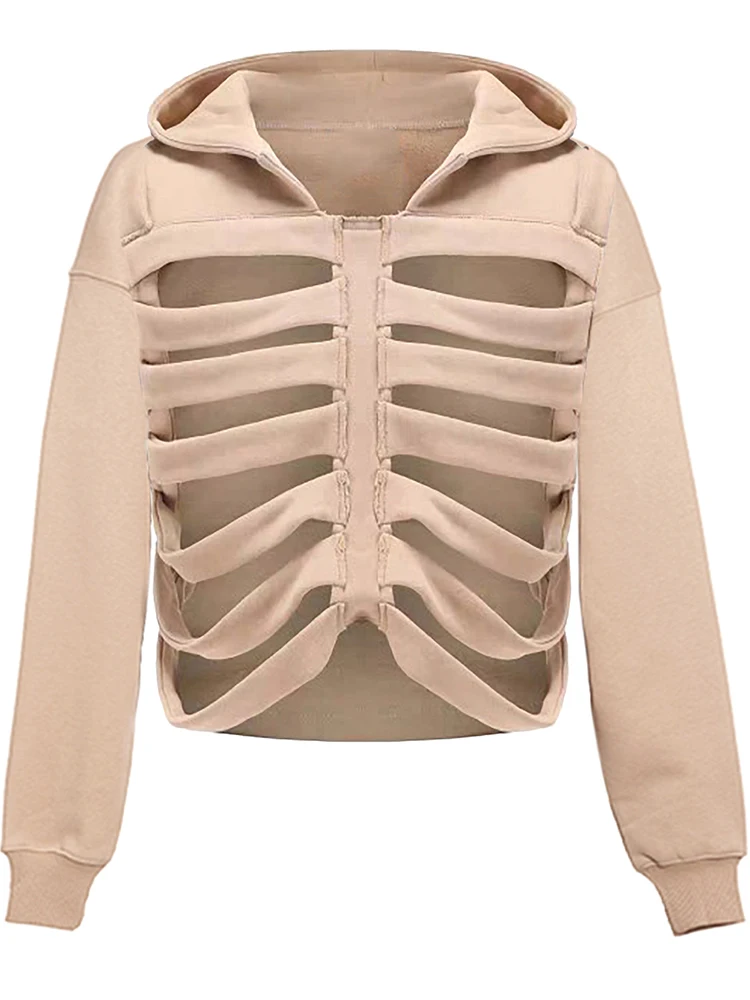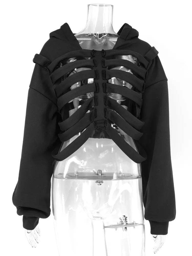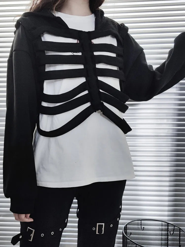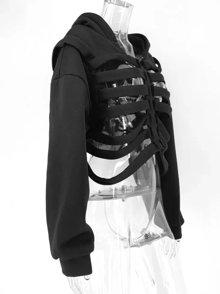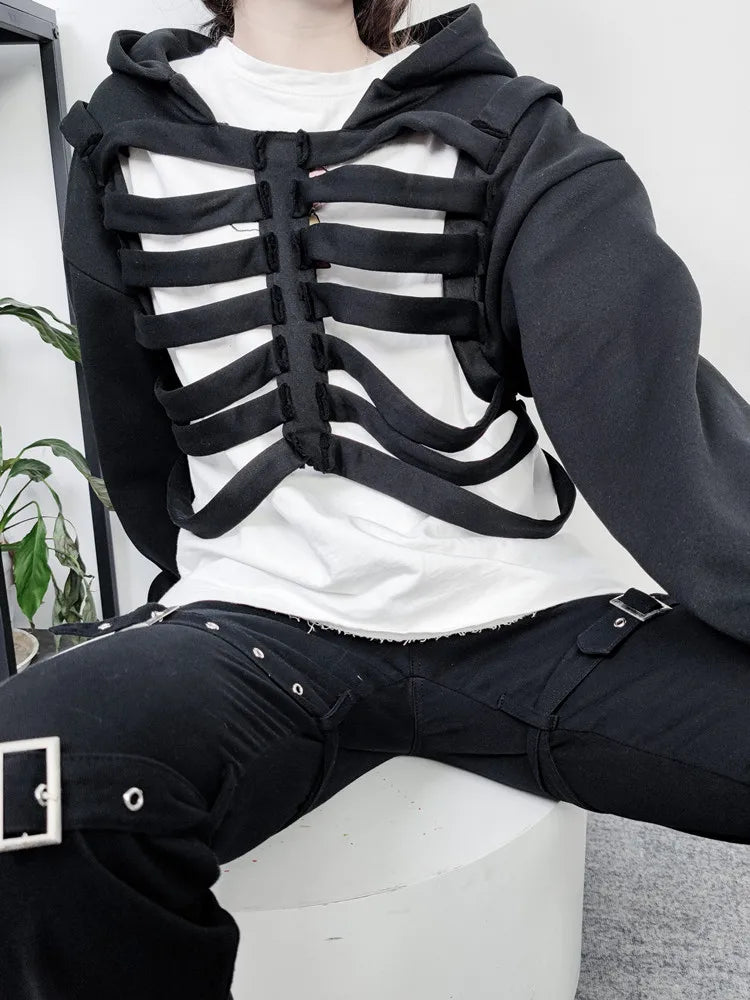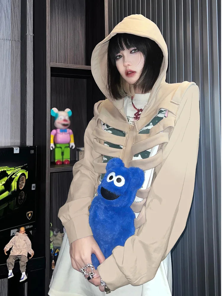 Yipinpay Women's Y2K Goth Cutout Zip-up Sweatshirt Grunge Long Sleeve Punk Harajuku Unisex Hooded Skeleton Hollow Pullovers