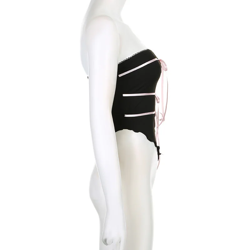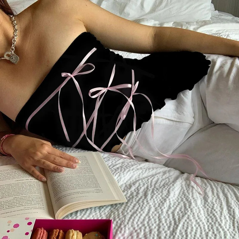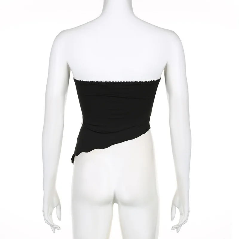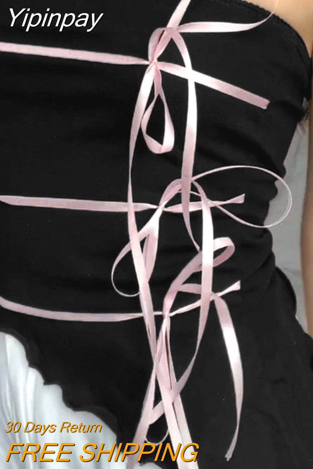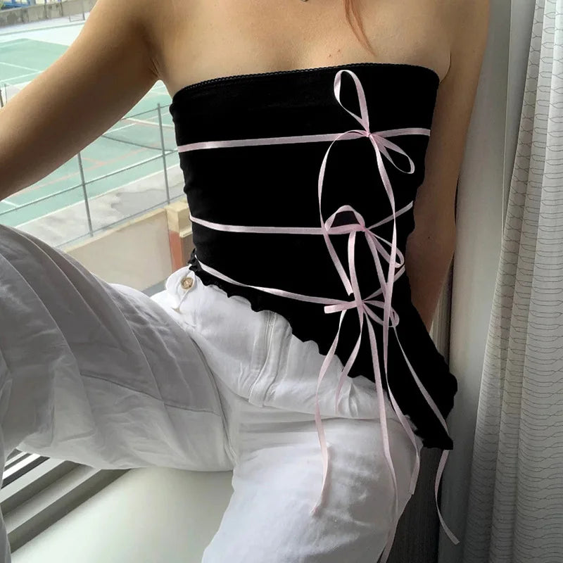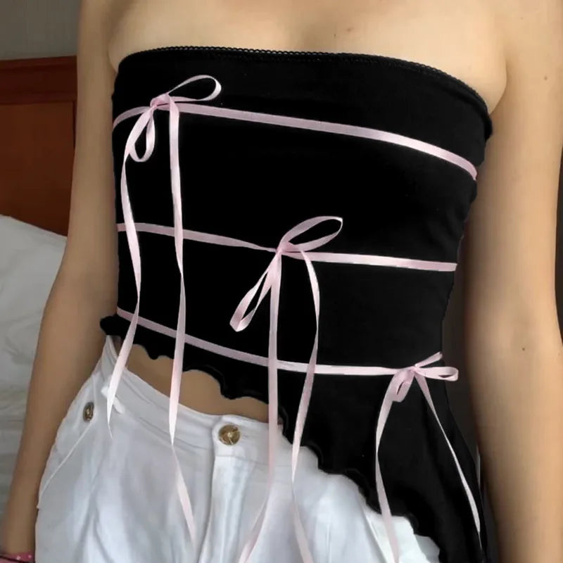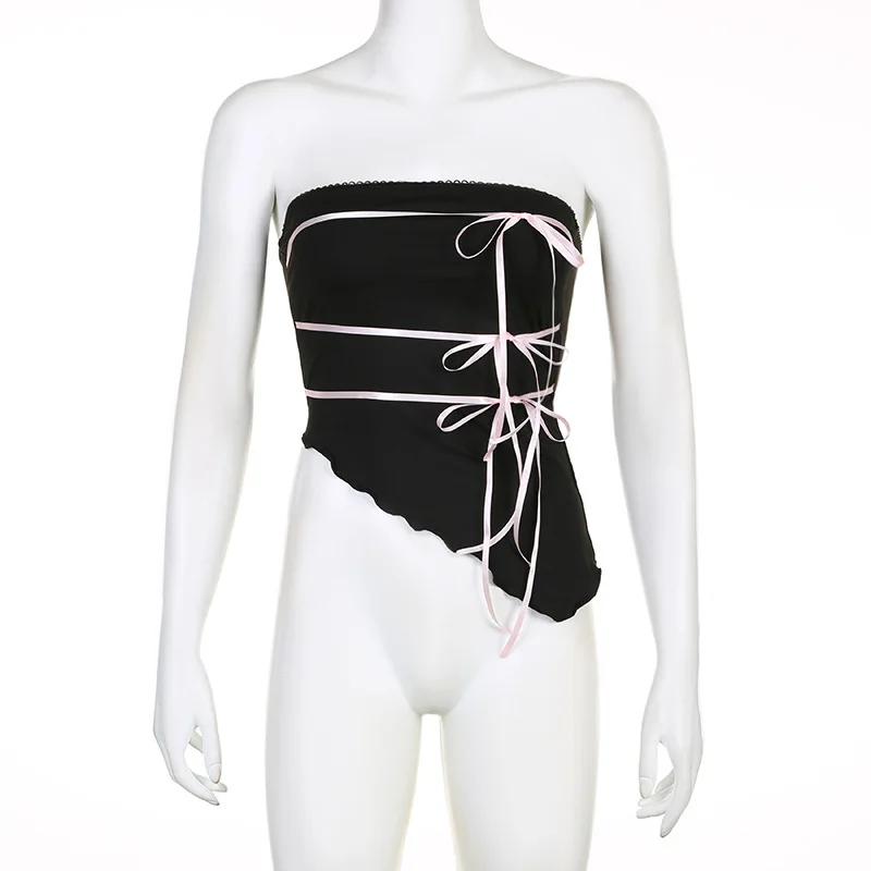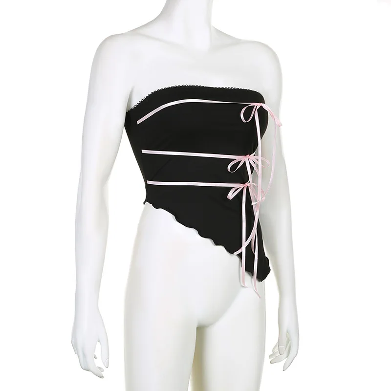 Yipinpay Women's Y2K Kawaii Ruffled Asymmetrical Tube Tops Summer Strapless Bow Front Bandeau Tops Lettuce Trim Fairy Tanks
