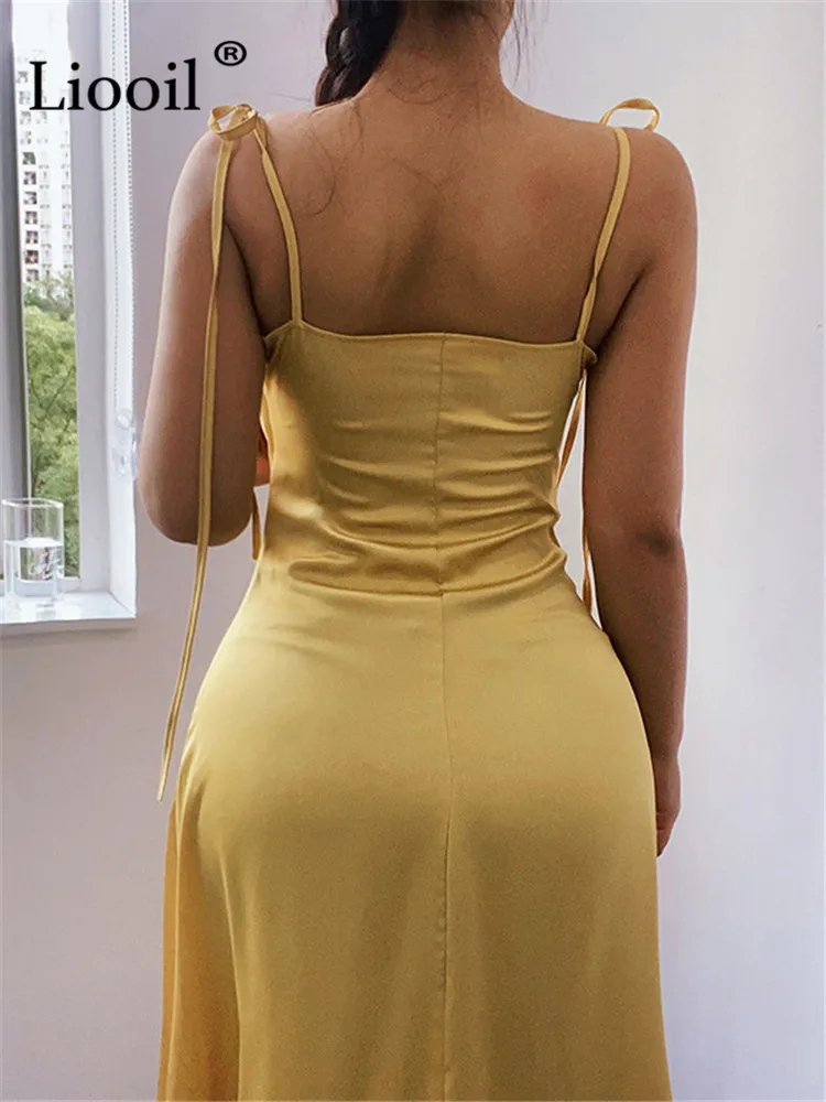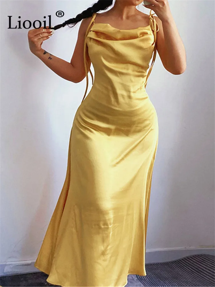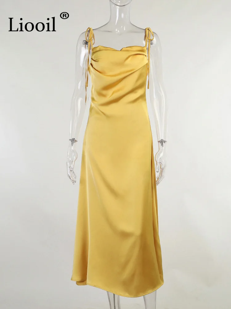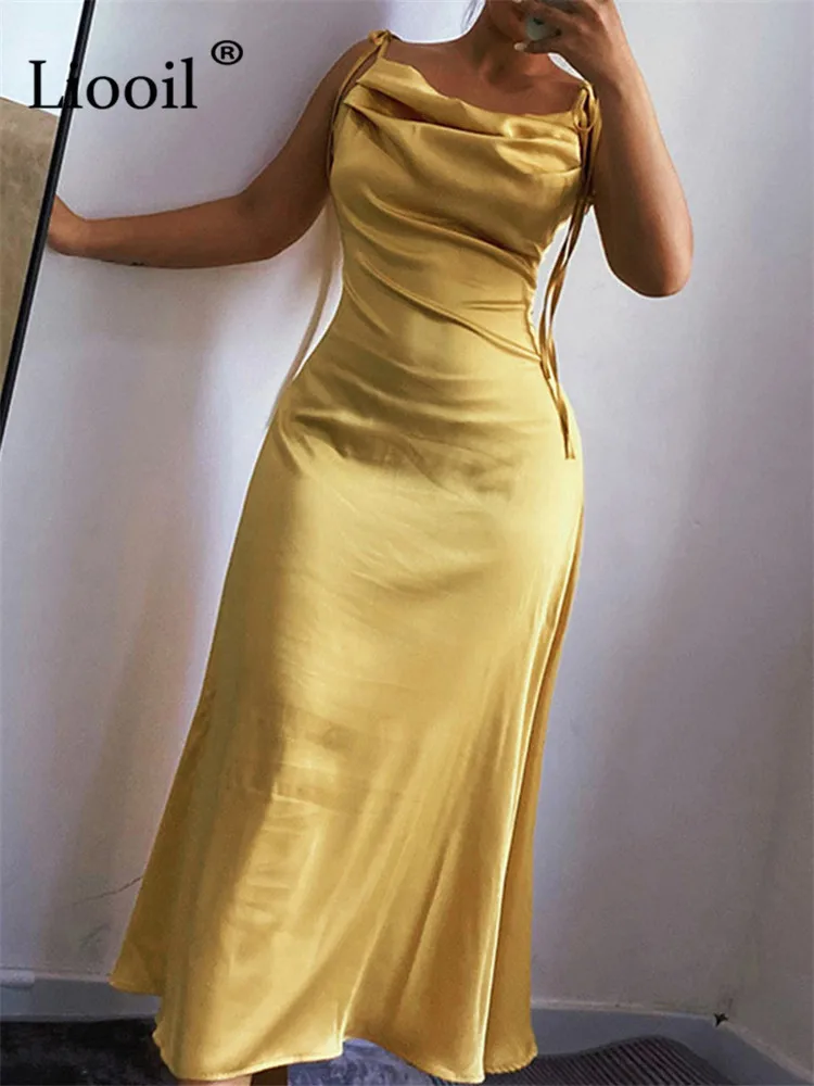 Yipinpay Yellow Satin Ruched Midi Dress Women High Waist 2023 Summer Spaghetti Strap Robe Backless Drawstring Party Sexy Dresses