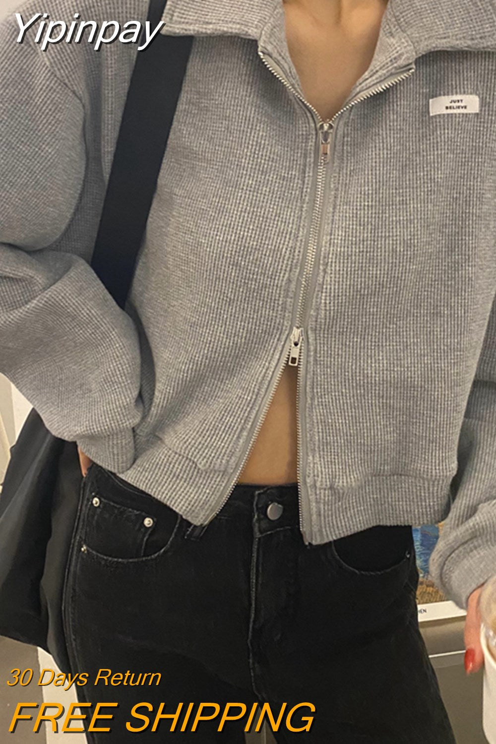 Yipinpay Zipper Women Cropped Jackets Fashion Letter Print Loose Sweatshirt Korean Casual Y2K Tops Harajuku All Match Lady Clothes